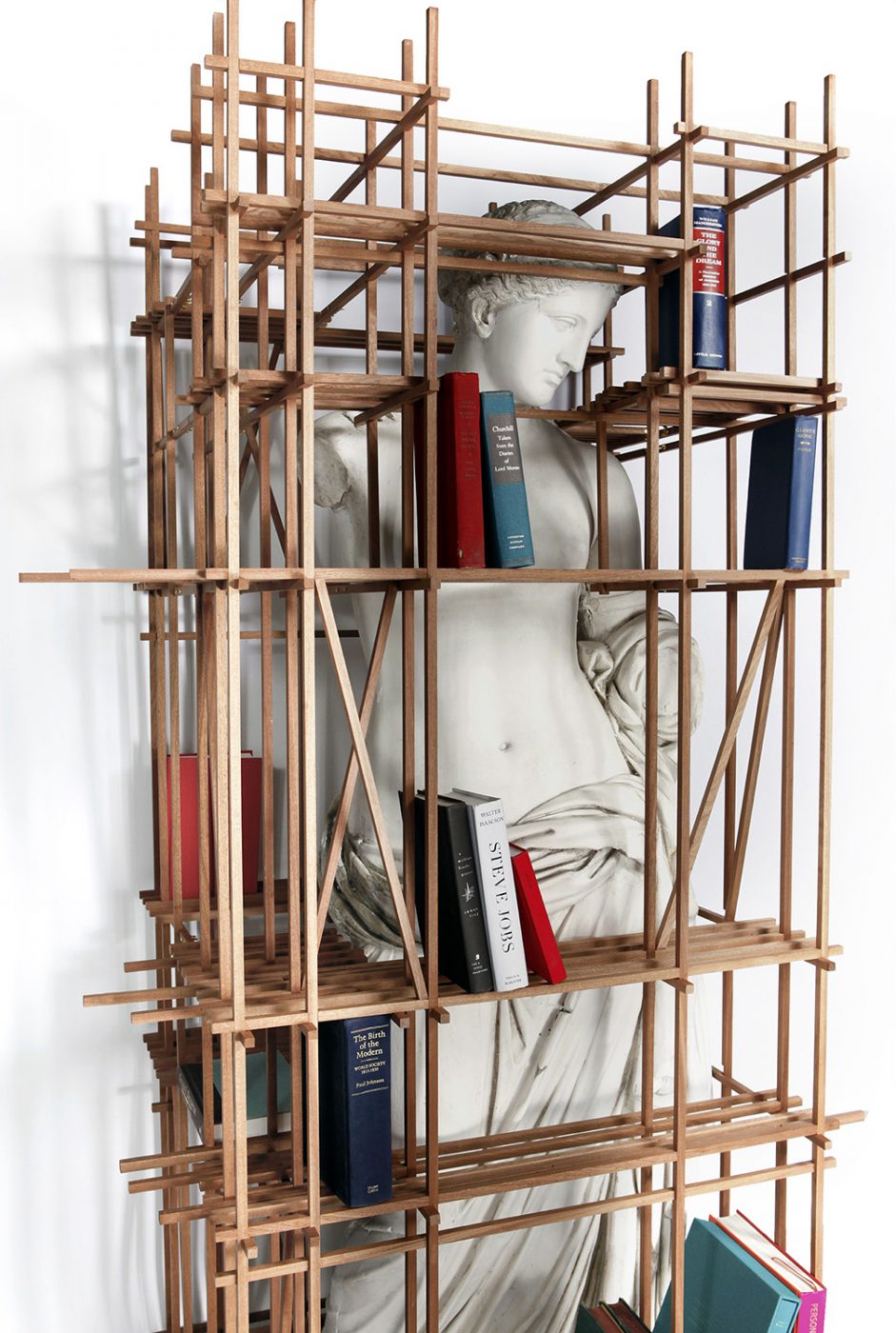 The fluid body of Venus draped and half-naked creates a contrast with the wooden scaffolding that at first glance seems randomly arranged, but is carefully constructed and positioned to accommodate books and other objects. Sebastian manages to transform a piece of art into a functional element, combining the lines of art and design into a piece that creates the exhibition