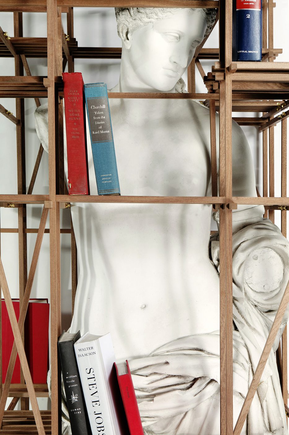In the foreground, an intricate system of strategically placed mahogany shelves surround and veil the marble statue, creating an interesting play with the visible and the invisible. Its function is that of a bookcase, but it can also be interpreted as a "scaffold", giving value to the object almost as if it were an ancient sculpture under protection