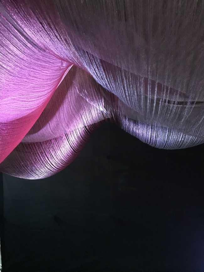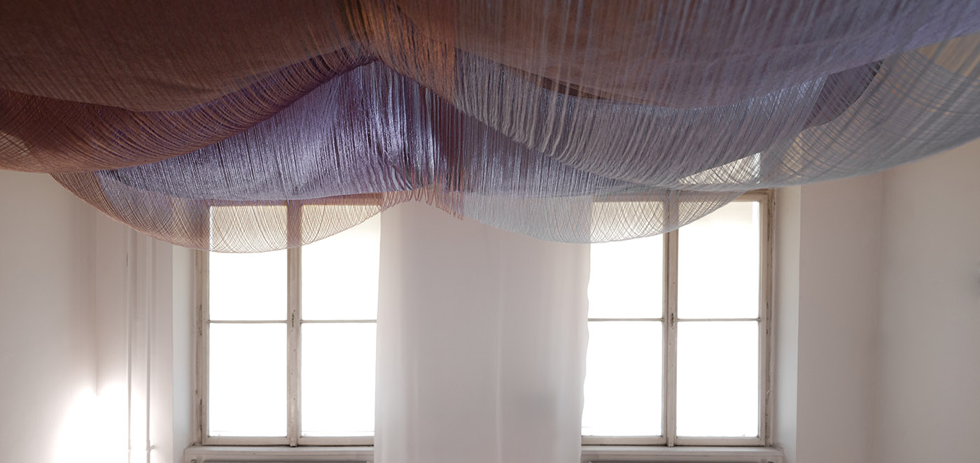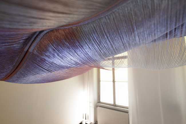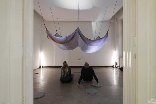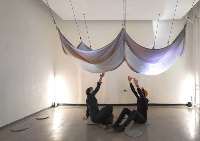 The Swiss-German art collective made up of Marie Schumann, Lisa Marleen Mantel and Matthias Rosenthal creates an interactive installation with light, floating fabrics that intertwine and move with the touch and passage of visitors.