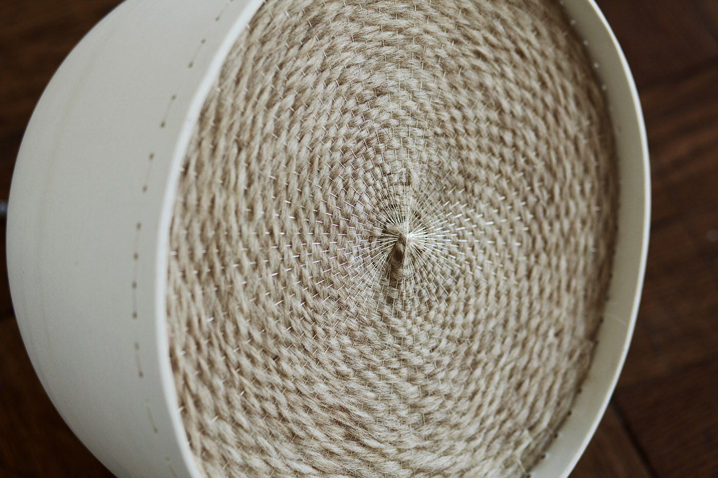 Pure design with touches of intense materials: the Colum lamp and its raw wool weaves