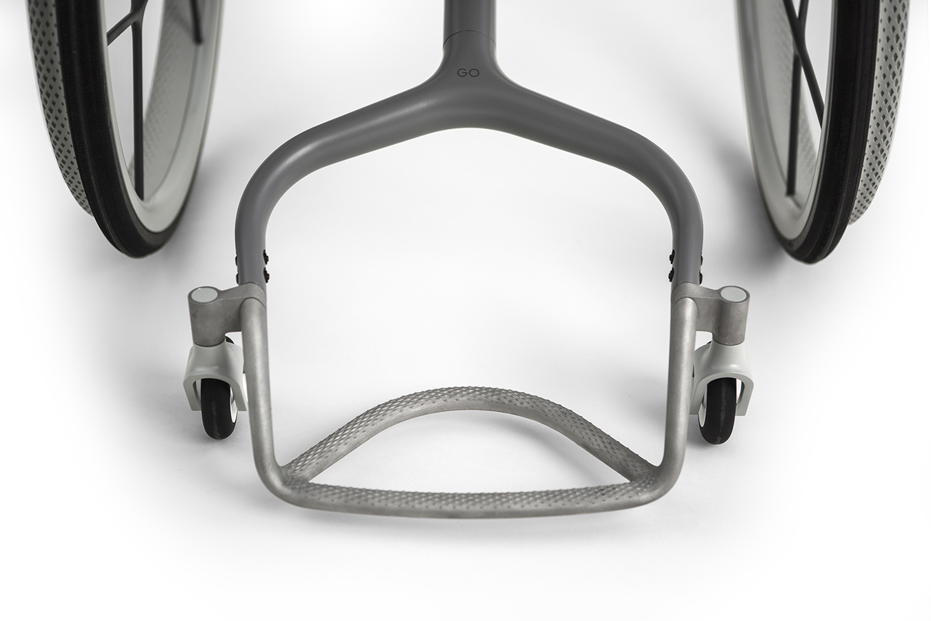 The GO wheelchair has super tactile push rims with a surface designed to lock into the GO glove system of the wheelchair, also designed by Layer, to offer a higher power-to-thrust ratio.