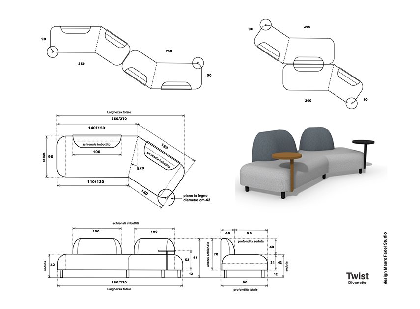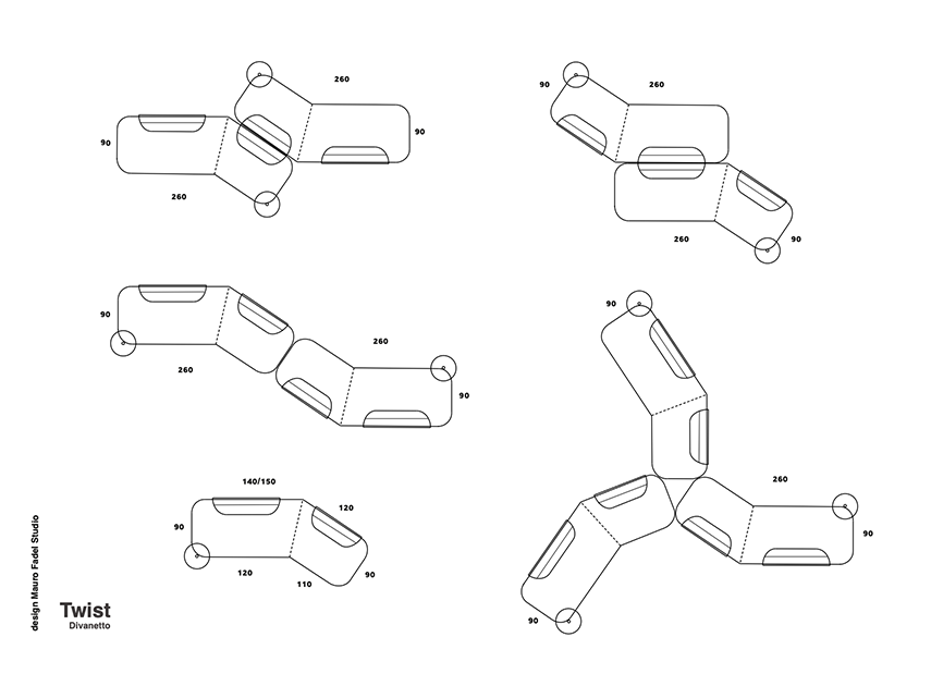 Twist is born from the idea of transforming space into a dynamic and evolving environment, a place where the presence of furniture becomes gesture and rhythm. Its zigzag shape guides the eye along a fluid and unexpected line, creating a continuous dialogue with the architecture and those who inhabit it. The sofa does not simply occupy space, but interprets it, offering personalized perspectives and a strong scenic capacity. In residential settings, public spaces, or contemporary hotels, Twist becomes a recognizable graphic sign, capable of transforming the perception of the environment.