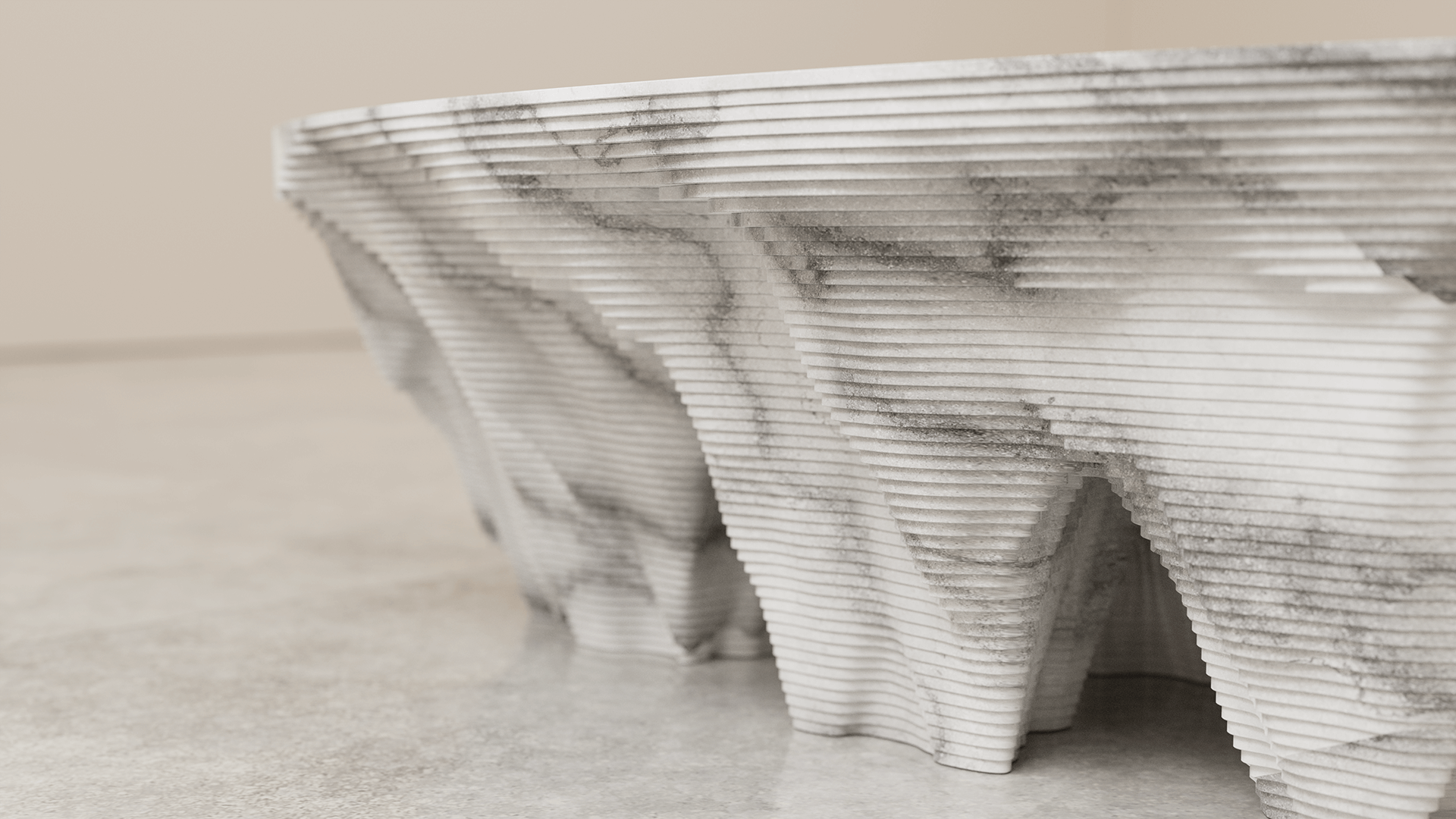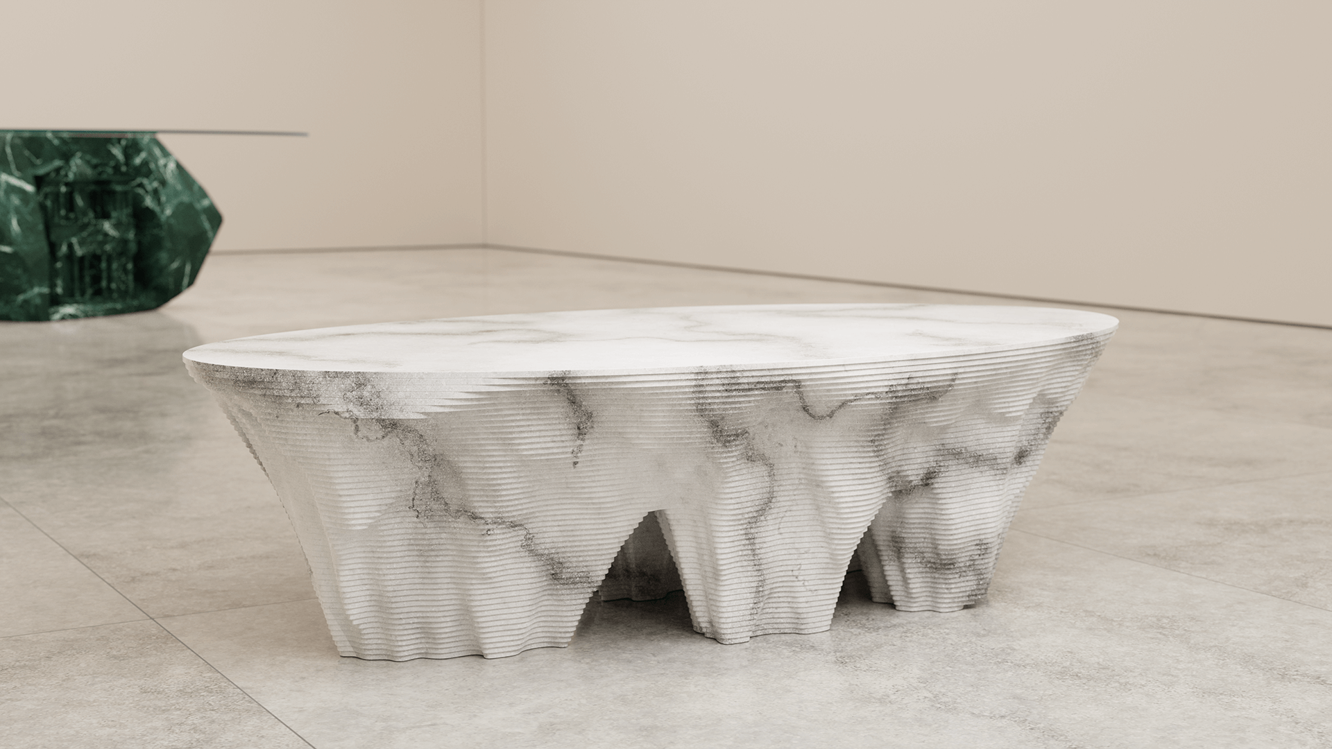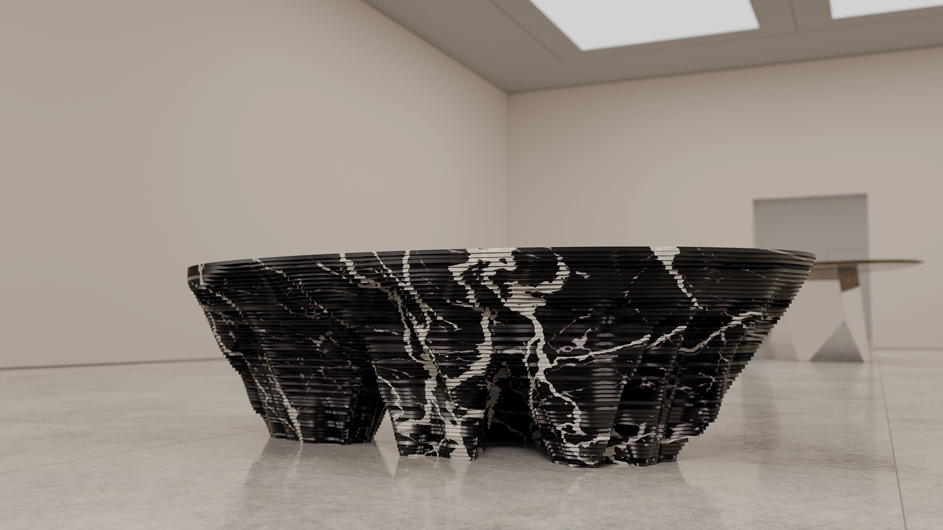 In the design piece, a series of majestic, contoured shapes rise from the ground, merging together into a singular, flat piece of carved stone. "We were inspired by the iconic sandstone rock formations of Monument Valley and an American vision of the American West for a layered marble table that rises from the floor, carved in a way that represents a desert mirage of the original sandstone butts," Chris Duffy further states