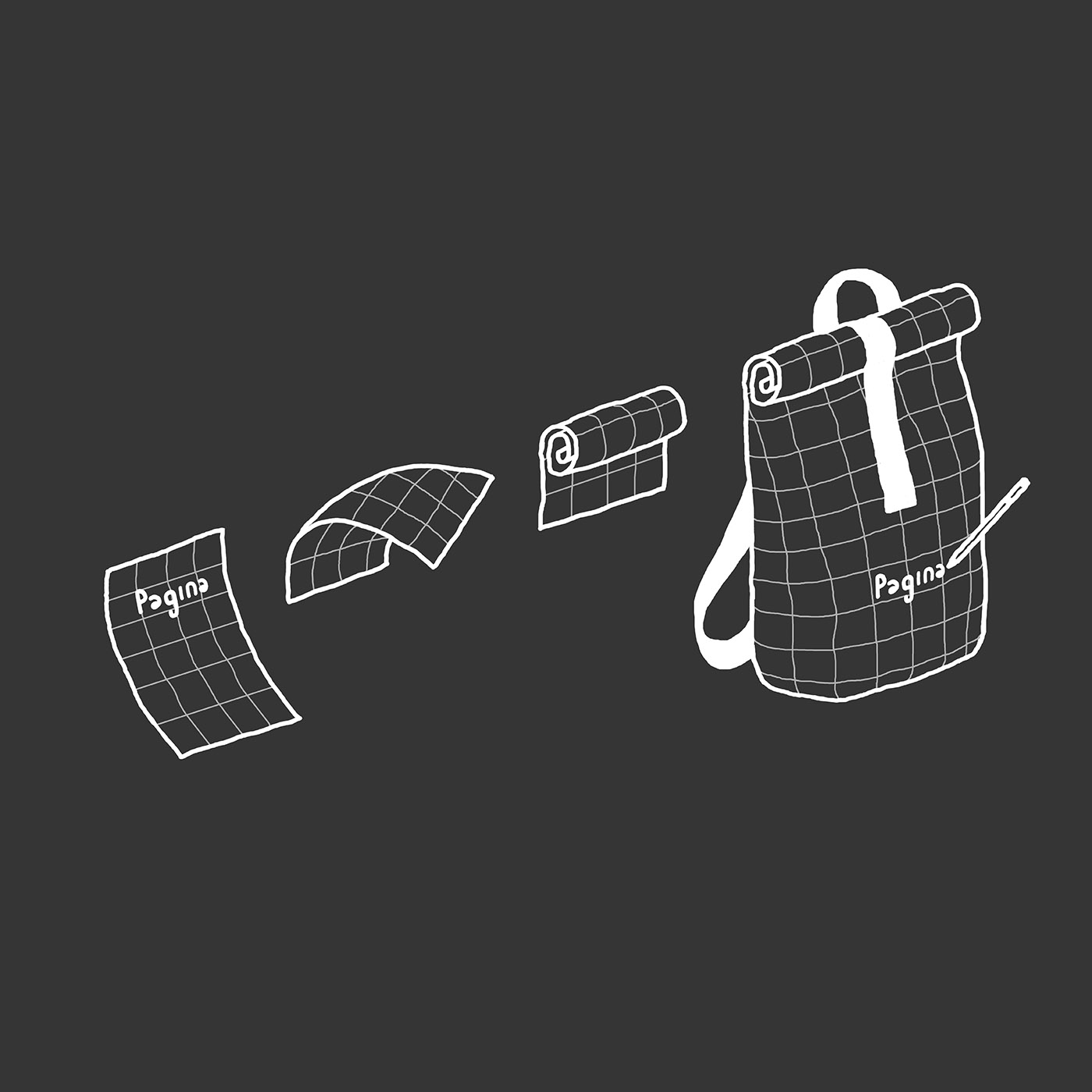 The collection consists of a backpack, notebooks and pencil cases: pages that contain objects, thoughts and signs