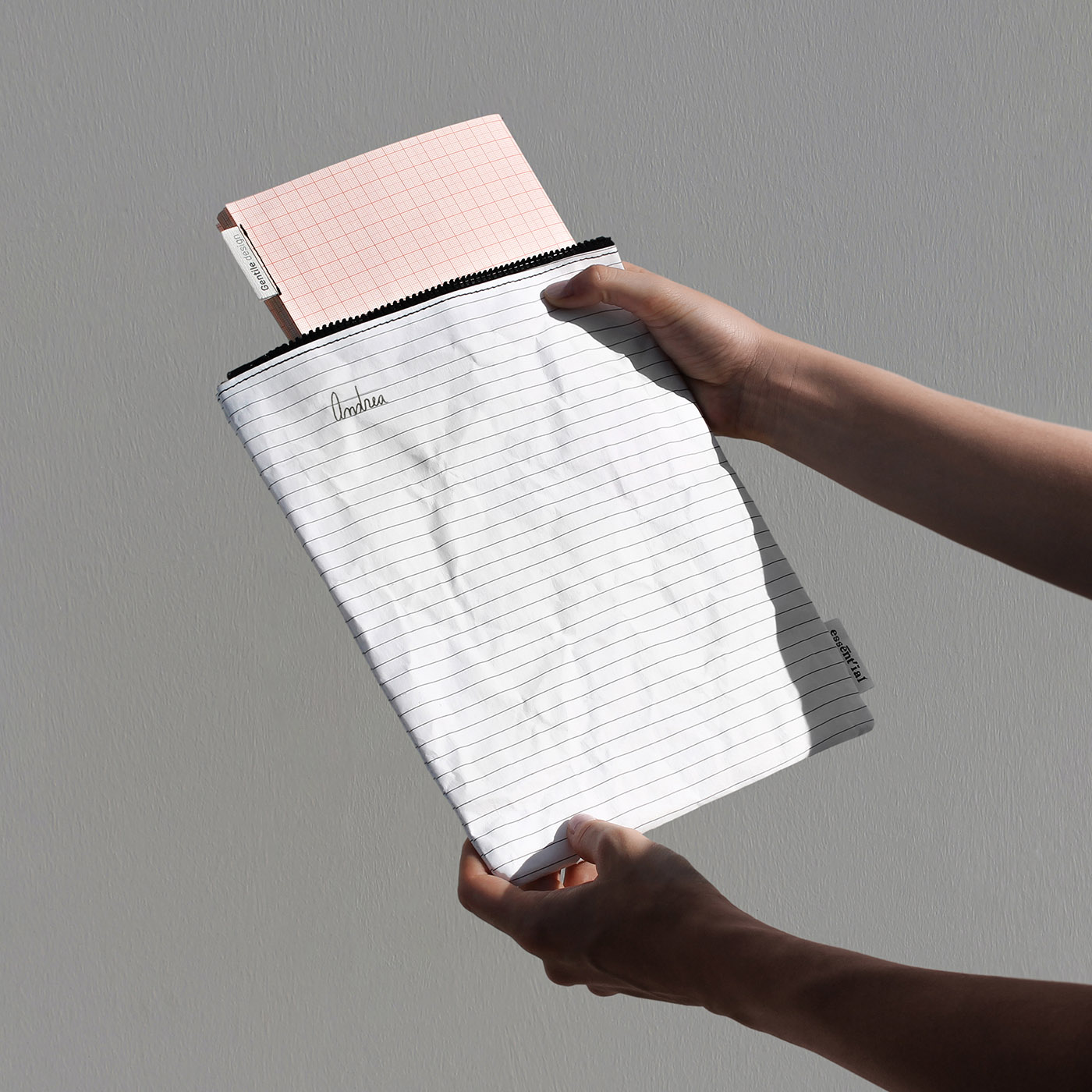 The design concept is to emphasize the material in which the collection of accessories is made; typical notebook stripes decorate the items by manifesting their nature