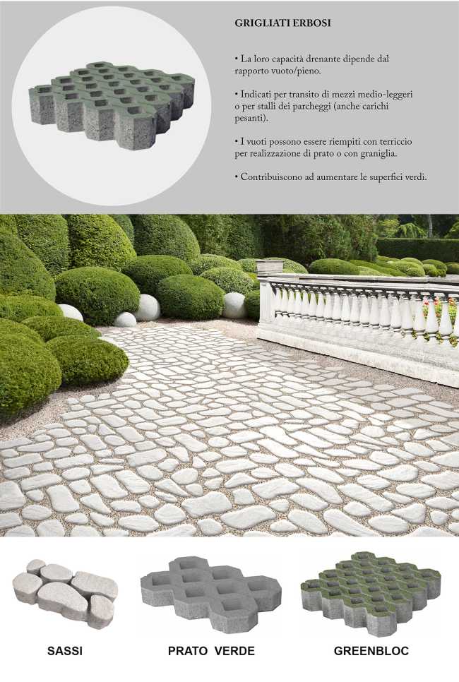 Gli elementi grigliati sono grandi piastre forate, generalmente quadrate o rettangolari con spessori variabili da 8 a 11 cm. La loro capacità drenante aumenta in base a due fattori: al valore del rapporto vuoto/pieno dell’elemento di pavimentazione e al materiale di riempimento dei vuoti (il terreno da coltivo è di bassa permeabilità; la sabbia è di media permeabilità; la graniglia presenta un’alta permeabilità)