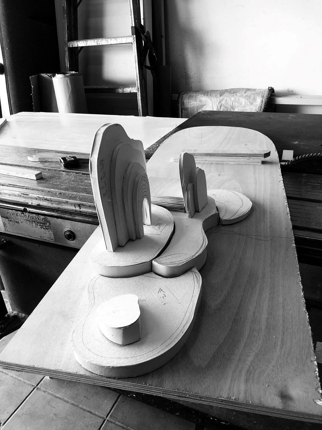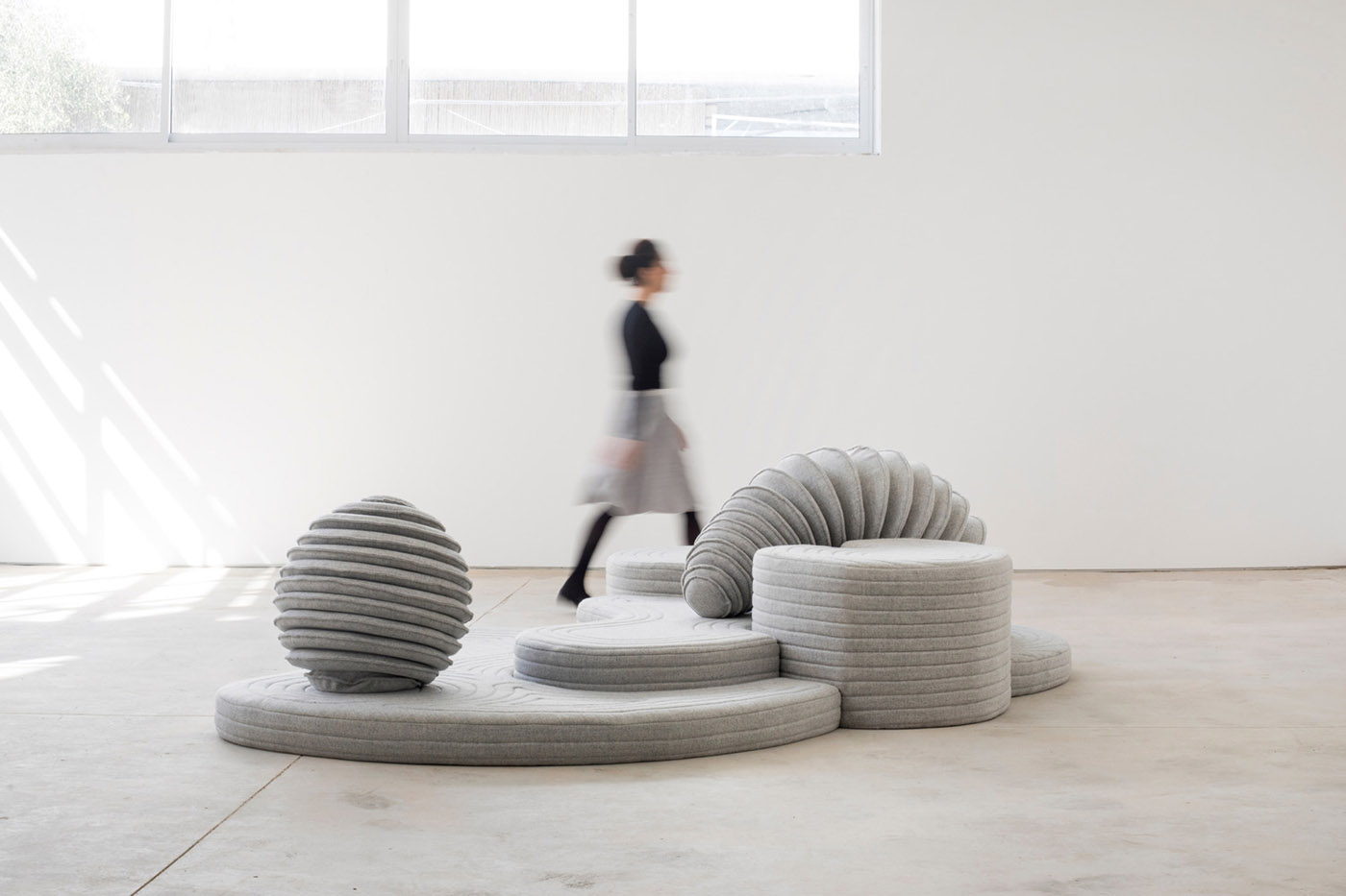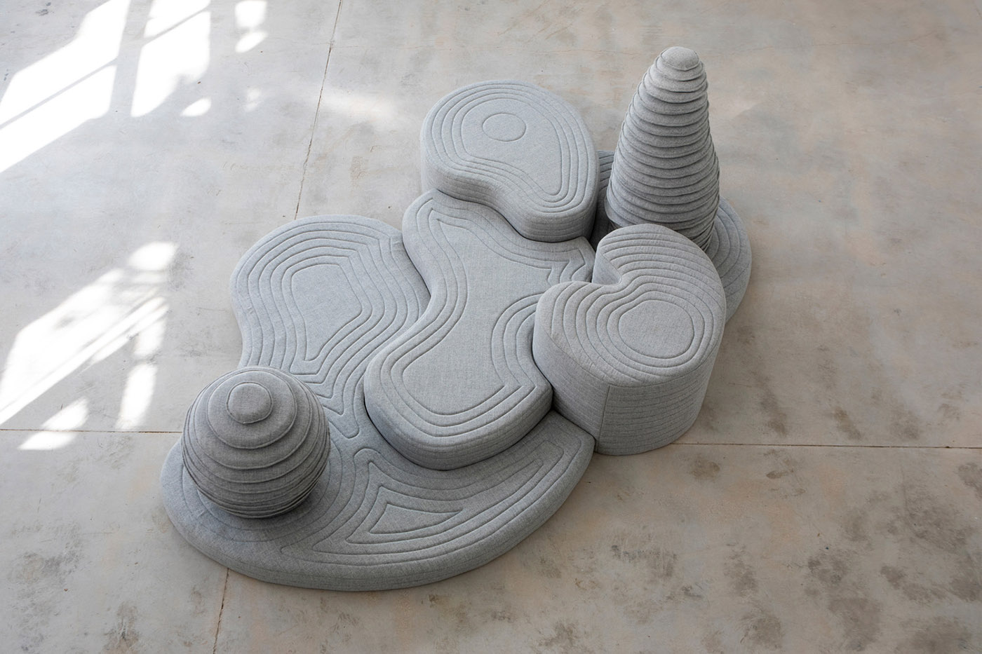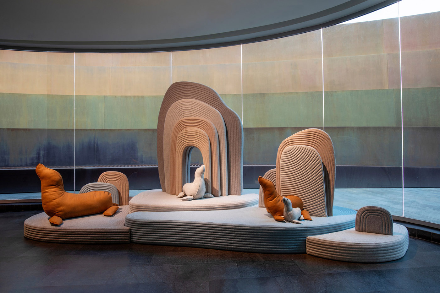 For the Black Box exhibition, Sarit Shani Hay created an imaginary landscape with padded volumes that evoke rocky coasts inhabited by sea lions, seals, bears, and other creatures. The pieces, in shades of blue and taupe with arched forms, resemble secluded bays and steep cliffs. The atmosphere of the installation and the colors of the designs change depending on the time of day, from a bright morning light to darker tones as the sun begins to set.