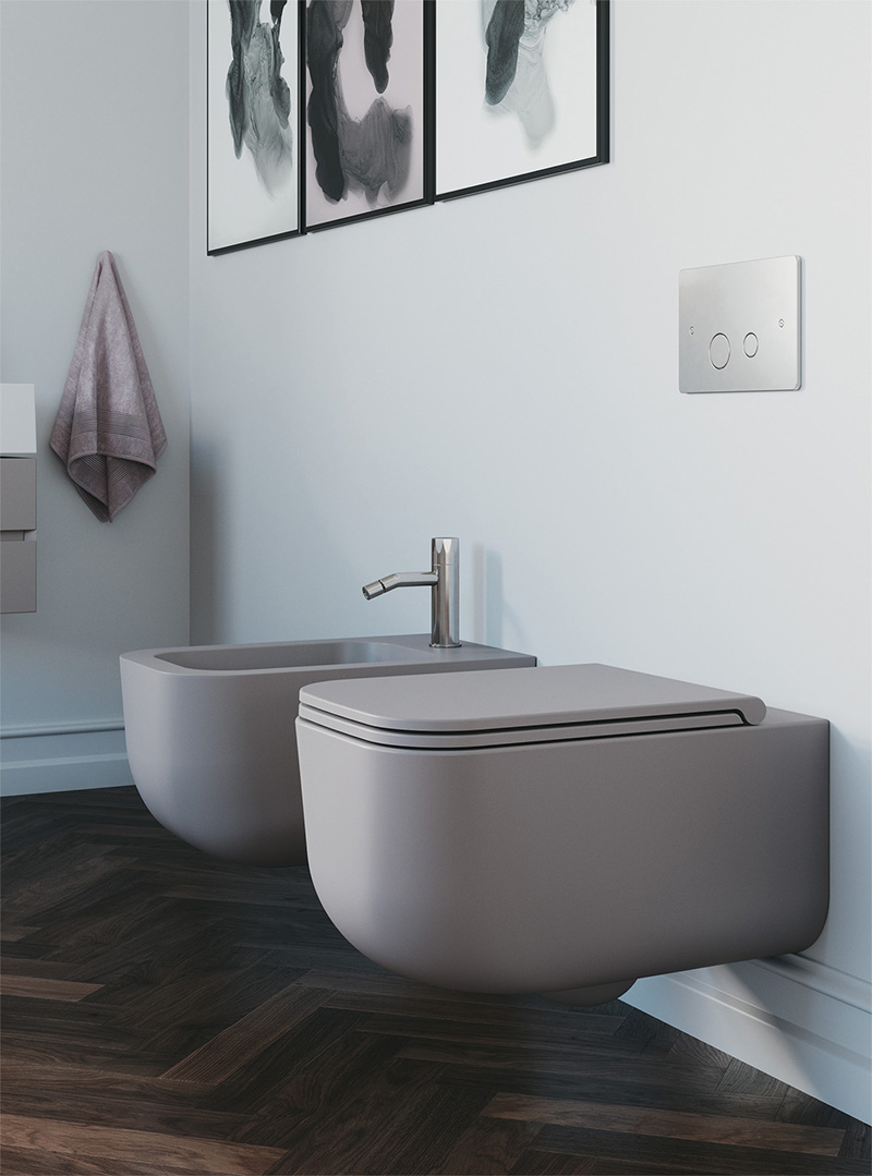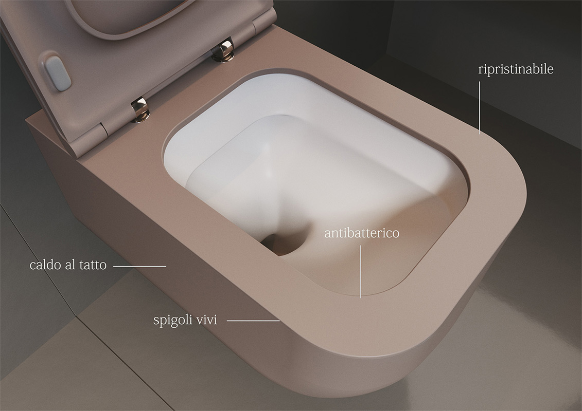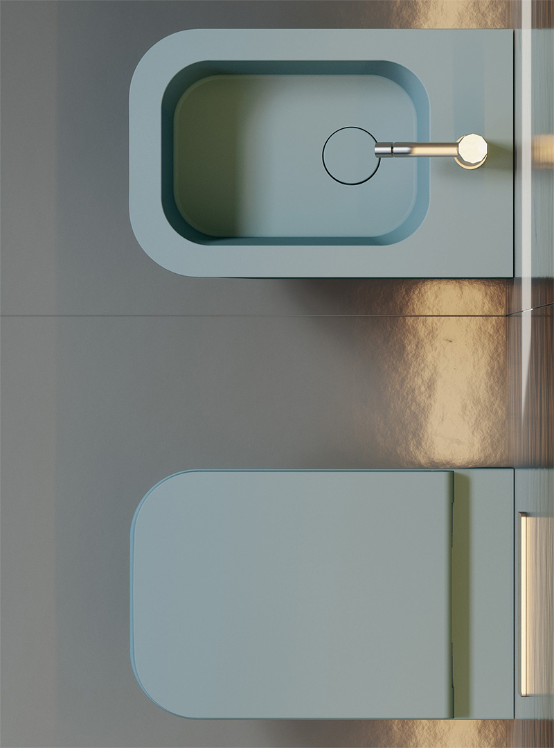 Il design del wc e del bidet è esaltato dagli “spigoli vivi” e non più arrotondati come nei classici sanitari in ceramica, inoltre le superfici perfette, senza alcuna irregolarità, la pulizia delle forme, gli spessori e le sue linee morbide conferiscono alla collezione una contemporaneità senza tempo