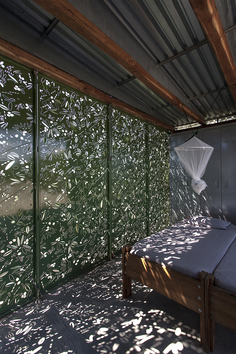 A corridor connects the spaces but also aligns with the adjacent olive trees, which thus become an integral part of the layout of the house. The outer shell is a light metal surface that envelops and is mobile, to provide maximum flexibility. The perforated fabric pattern is inspired by the shade of the olive trees. As the sun moves during the day, the interior spaces are full of ever-changing shadows