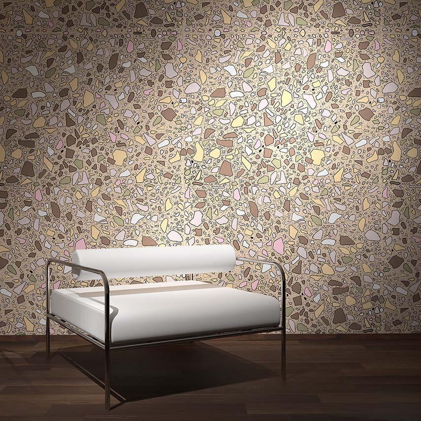 Sergio Mannino Studio presents a new wallpaper collection for Rollout, a Canadian design covering company. The collection includes 28 different decorations, divided into three main groups: Wood, Brocks, and Terrazzo