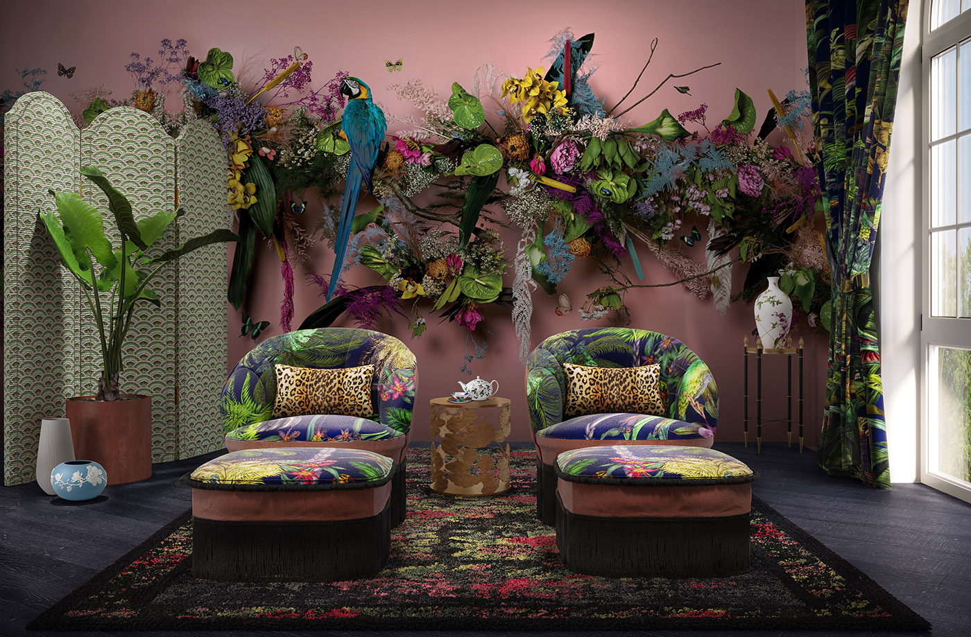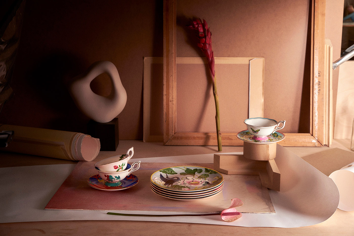 Claire Luxton reinvented the new Wedgwood patterns with a sculptural installation created in the artist's studio in East Sussex. Using flowers, plants, and animals, Claire Luxton has created a multidimensional installation that includes sculptural techniques, collage, photography, and hand-painted parts.