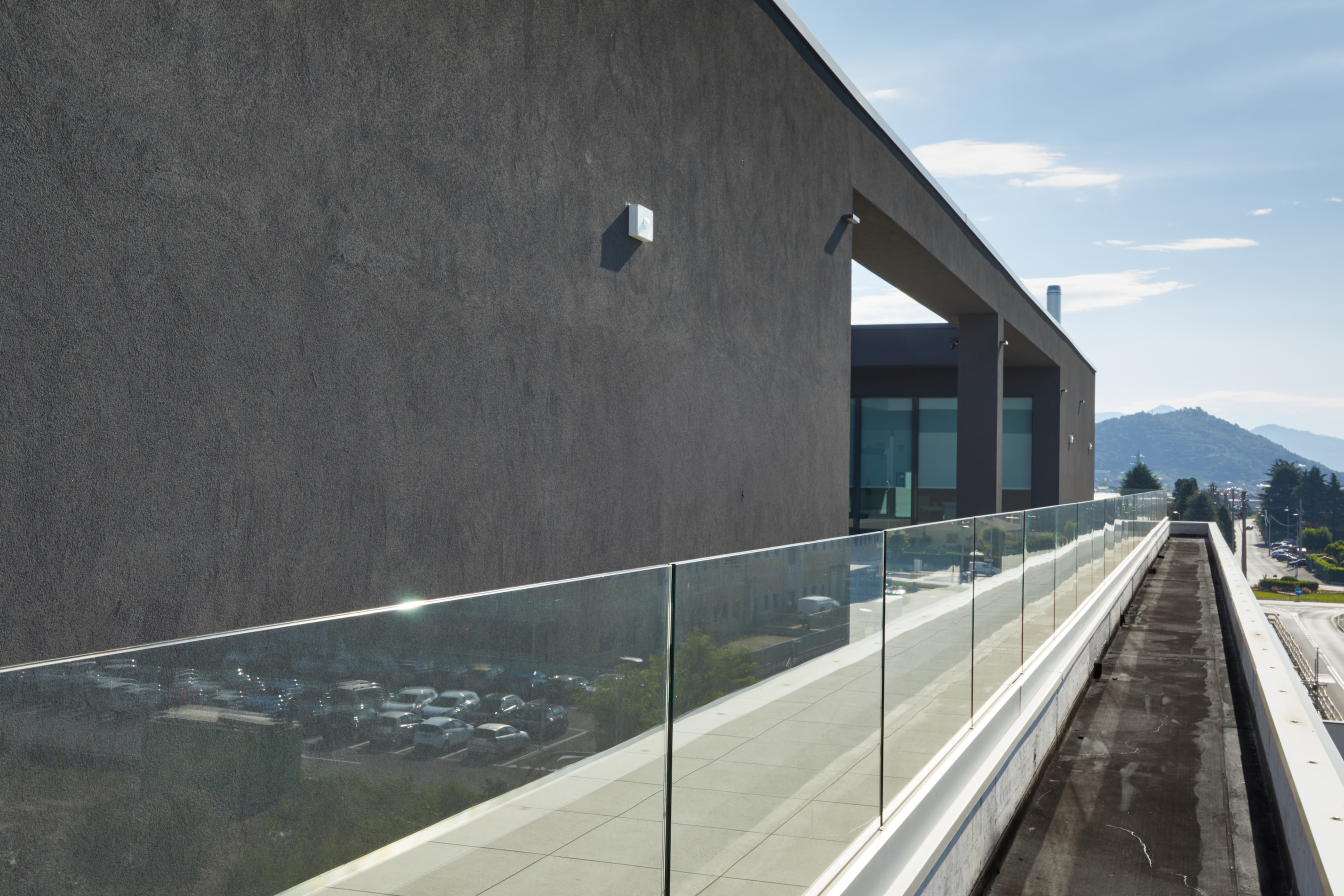 Each parapet can mount different thicknesses of laminated, tempered, and hardened glass, tested to resist static (human) loads and dynamic impact, ensuring maximum safety in case of breakage.