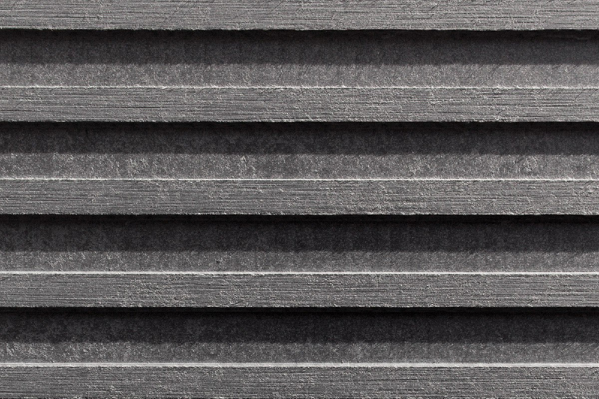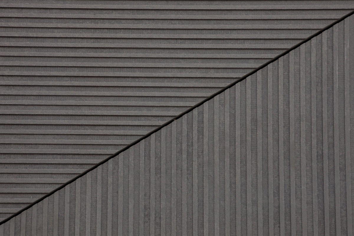 CHARACTERISTICS EQUITONE [line] is a fibre cement panel coloured in mass without painting. The main feature of this panel is its 3D finish that creates interesting effects of light and shadow. In fact, the lines of the carving with the passing of the hours of the day, make the material look different while enhancing the different shades of the fibre cement. The possibility to see the texture of the raw fibre cement between the carving lines, the presence of thin polishing lines and the small white spots on the surface give the slab a very natural look.