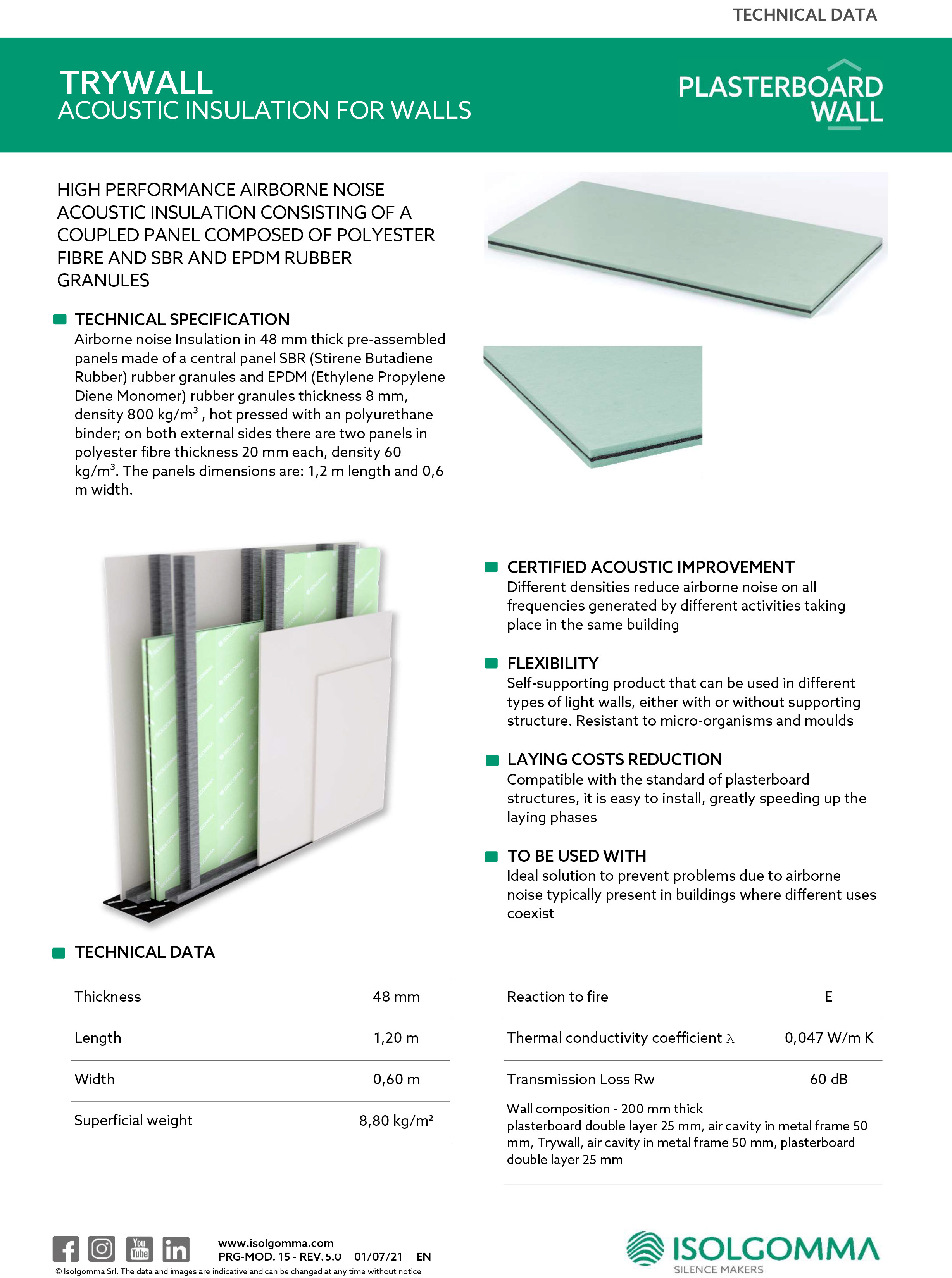 High values of thermal and acoustic insulation, high resistance to moisture and condensation combined with extreme ease of installation are the main characteristics of the Trywall 48 panel.