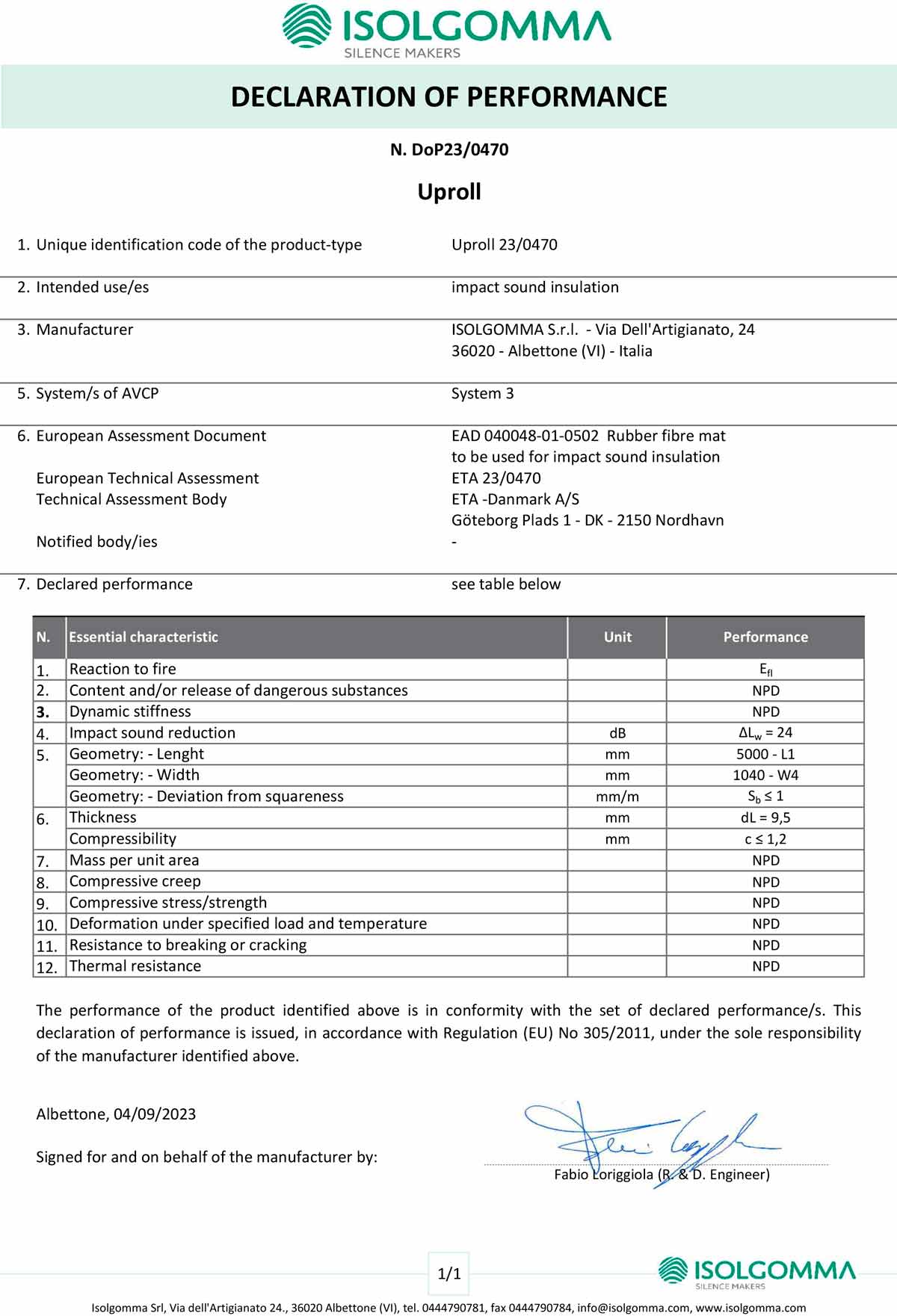 The roll made of rubber granules obtained from recycled ELTs, an acoustic and impact sound insulation with high performance and mechanical stability