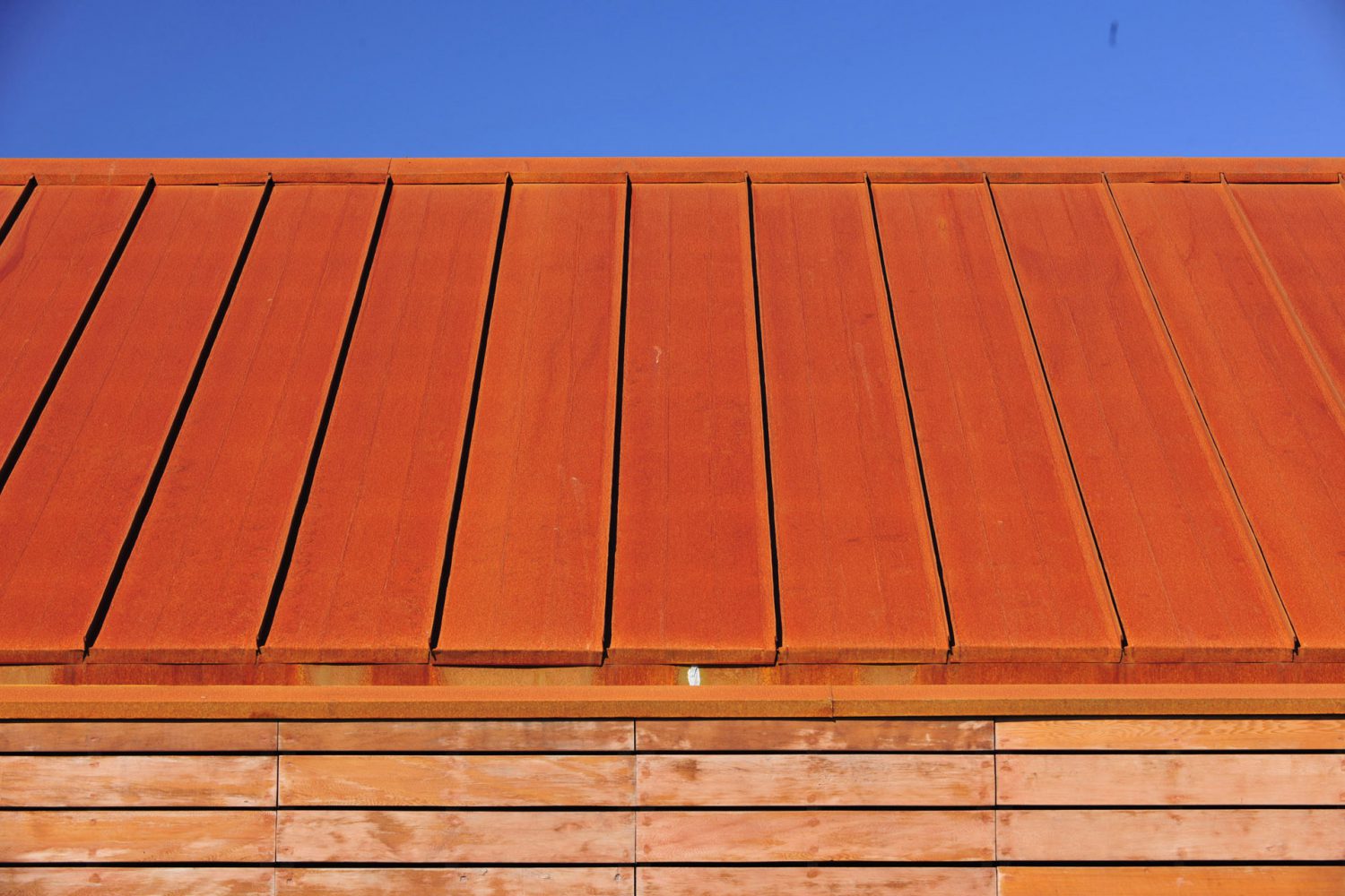 The material used is inspired by local farm buildings in the region, with a solid base, ventilated wooden facades half-open and permeable to light, metal roofs that over time oxidize and blend with the autumn colours of the adjacent woods and sunsets.