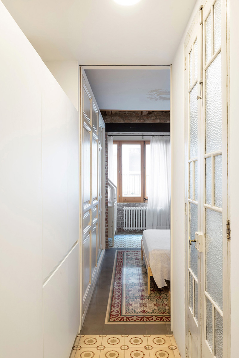 The apartment is 70 square metres and is located on the top floor of a building. The plan is long and narrow, 3.20x17 metres. On the two short sides, the house overlooks the street, through a French window and the inner courtyard.