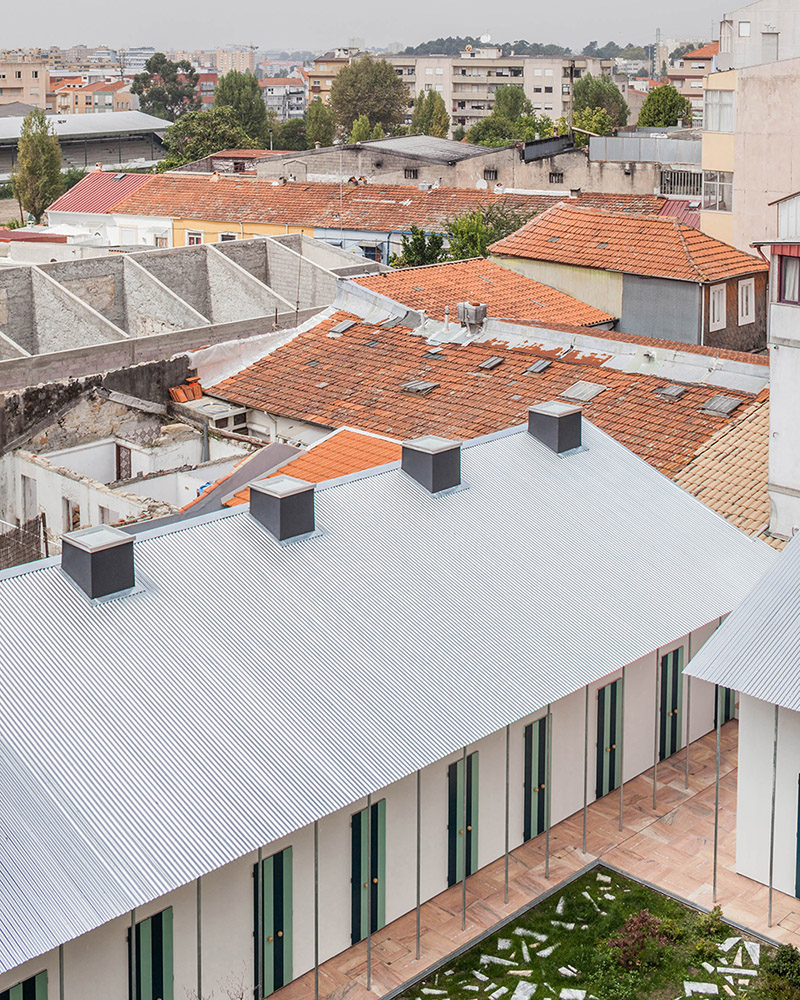 Six houses, four identical and two distinctive, share a common garden, within a block, whose composition of the interior space is full of different and fragmented geometries and different materials.