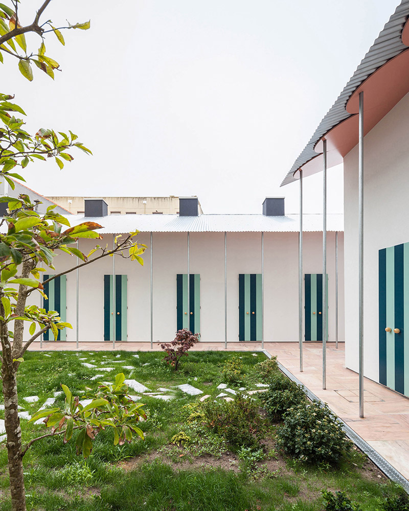 The houses define a continuous colonnade that frames the garden, so much so that it becomes impossible to understand where each house starts and ends. The façade is overlapped by rhythmic rows: the thin metal columns, the blue striped doors, the black skylights. The roof is also made up of two layers: a pink corrugated surface fixed under the sheets that underline the thinness of the surface