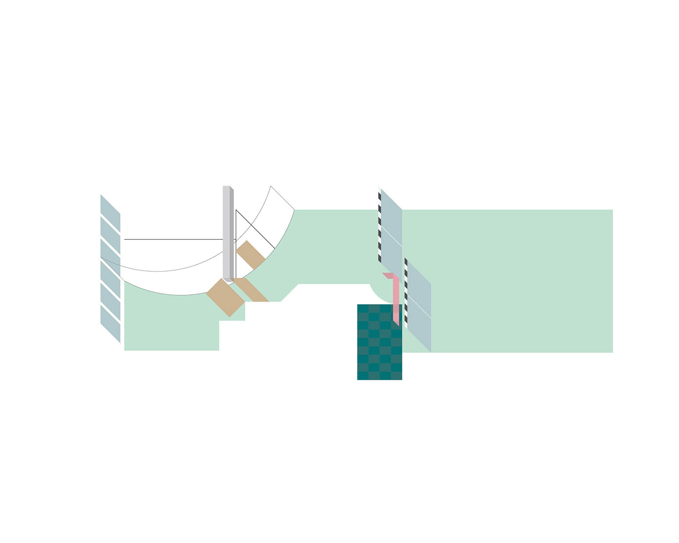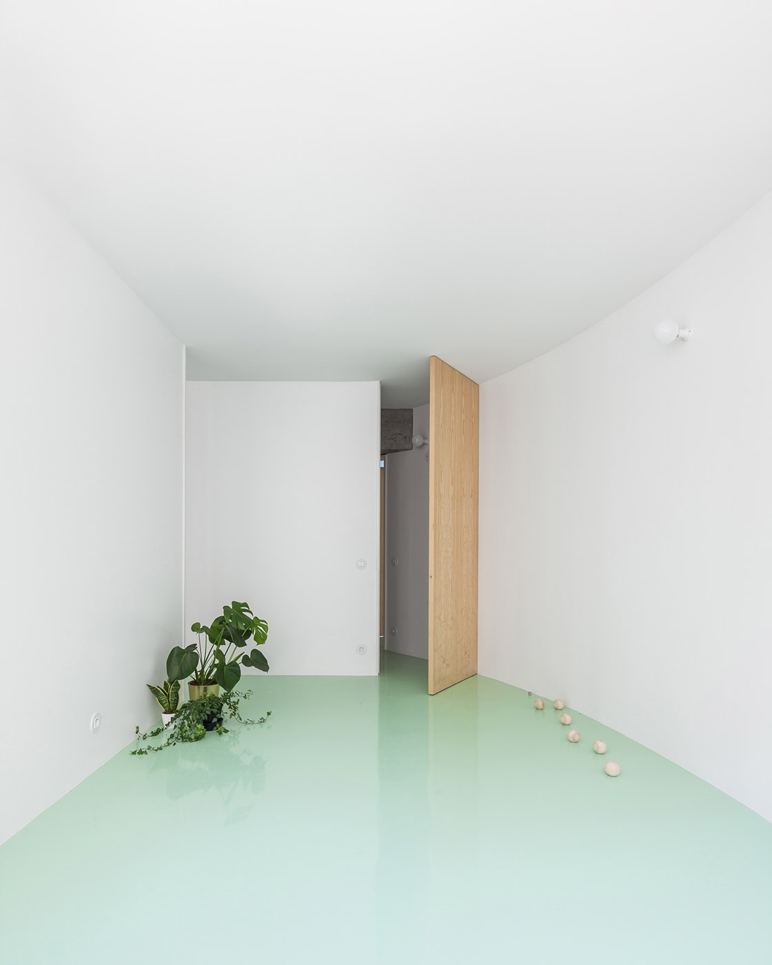 Floor of a redesigned modernist apartment building. The mint green floor links all the spaces
