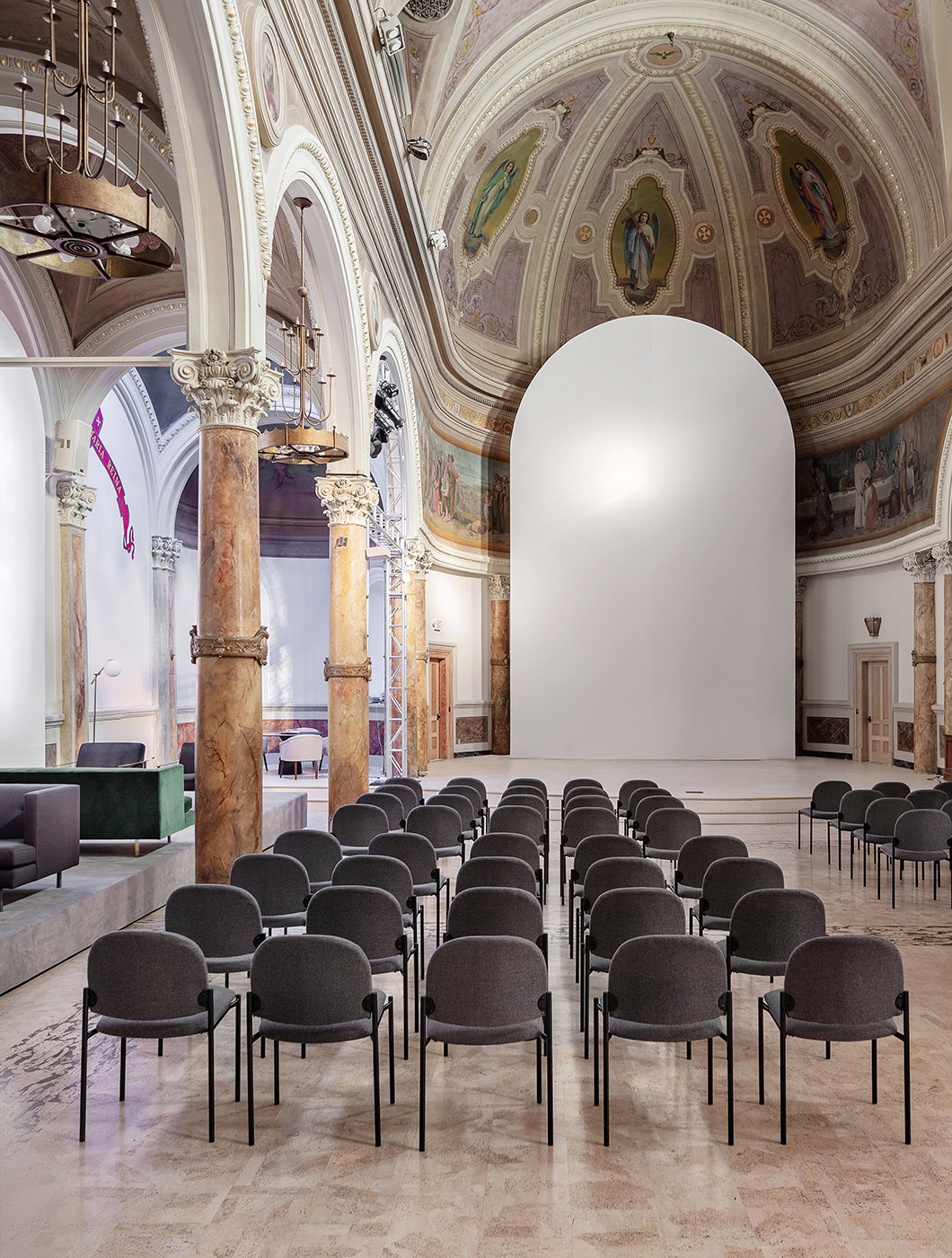 To hide religious themes from the stained glass, a multimedia frame with a translucent material on it has been designed. When light passes through it, an interesting refractive effect is created and the church is filled with rays of coloured light