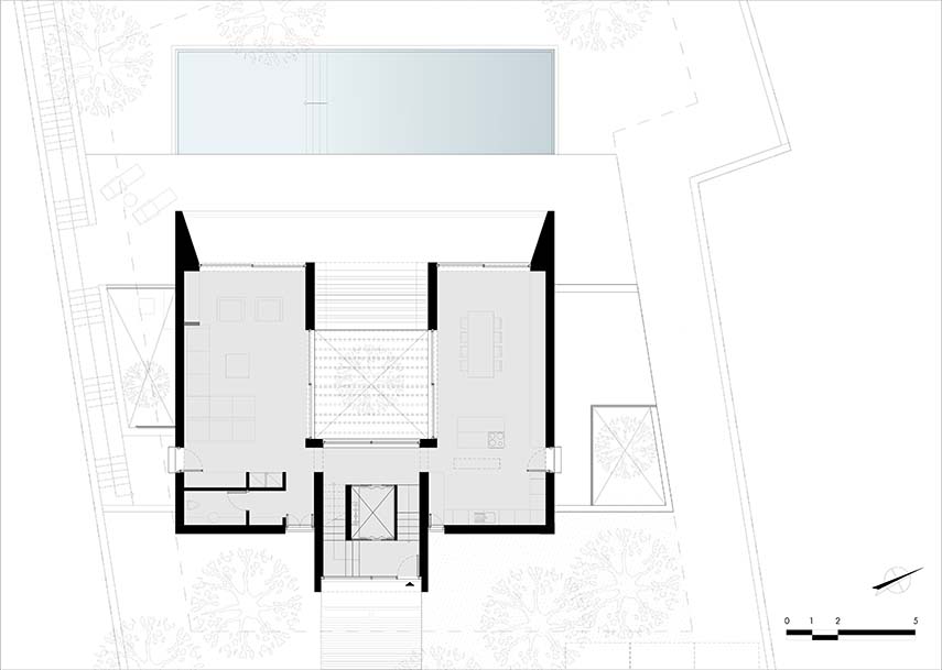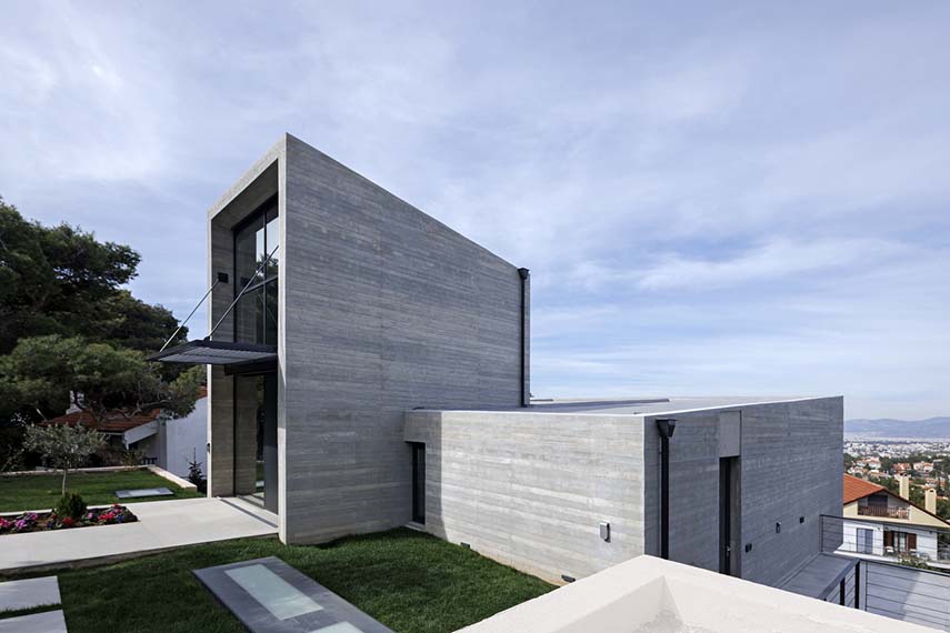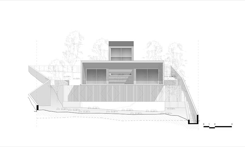 The ARISTIDES DALLAS Architecture studio is called to design a spacious residence on a lot characterized by a steep slope and surrounded by tall vegetation. The terrain's conformation allows for the stunning view to be utilized as the predominant architectural element