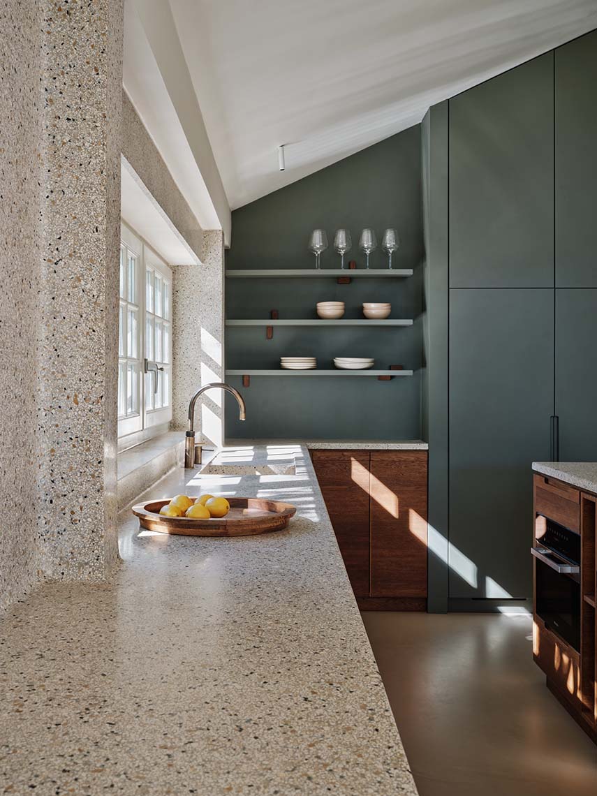 The warm gray resin floor, uniform throughout the ground floor, harmoniously connects every space. The open and welcoming kitchen is dominated by a cooking island with a terrazzo countertop, unique in its kind thanks to the carefully composed blend by Studio Modijefsky. The kitchen walls and counter are clad in the same terrazzo, framing the windows and creating visual continuity.