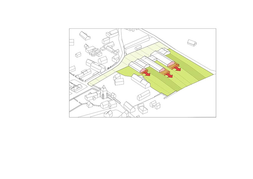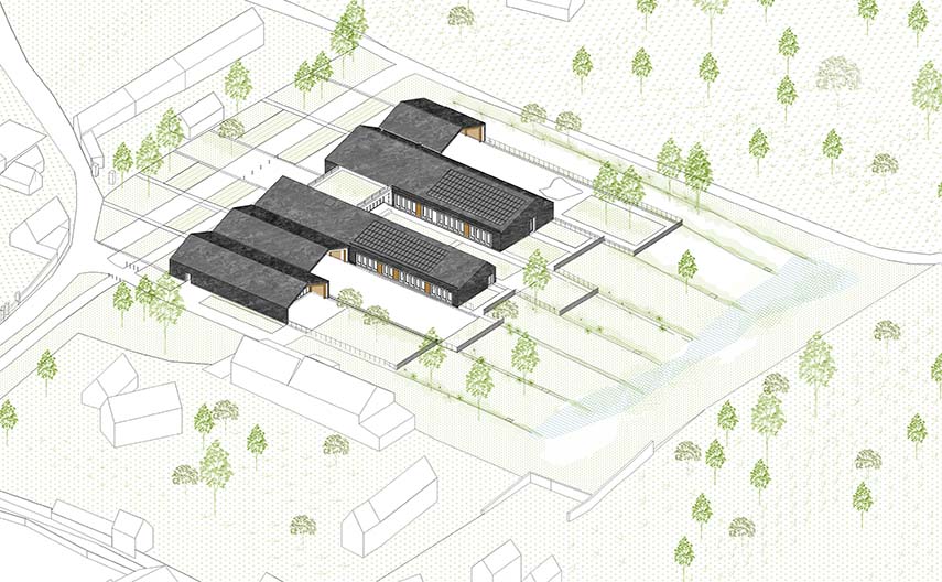 Thus, the wood from the houses of the Norman Village, the characteristic lattice for the window frames and structure, the slate from the bell tower and town hall to cover and protect the facades and roof are the main materials that construct the new school structure.