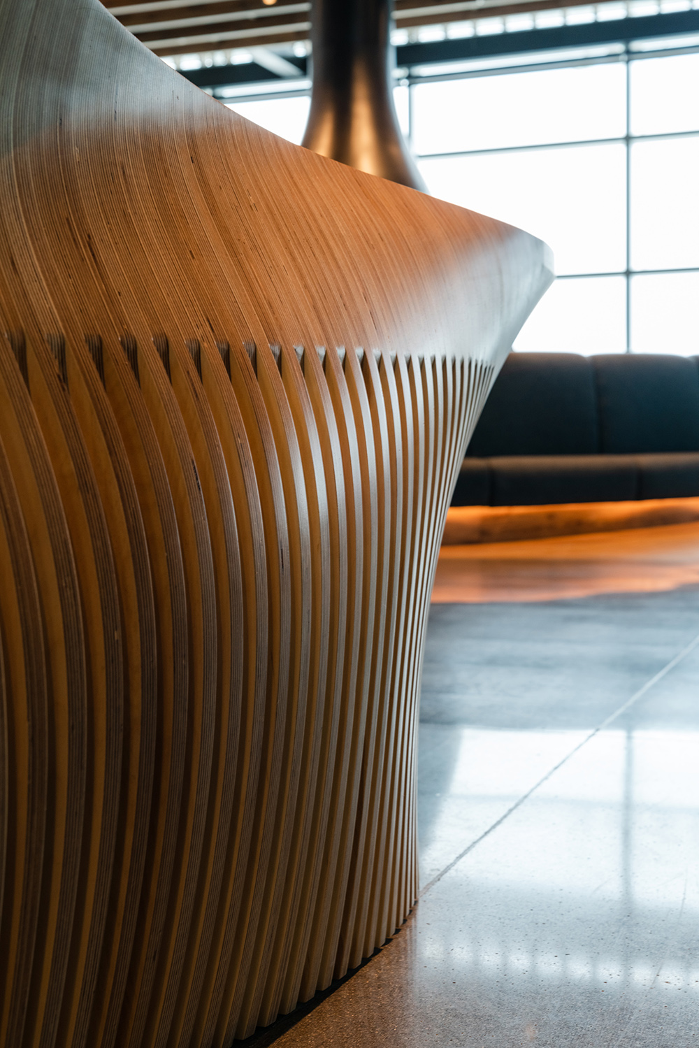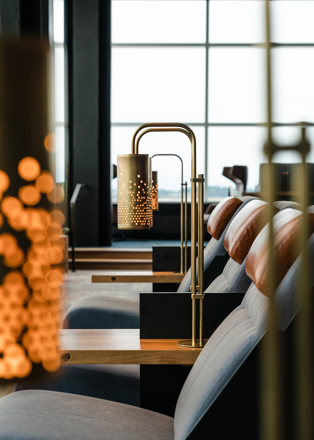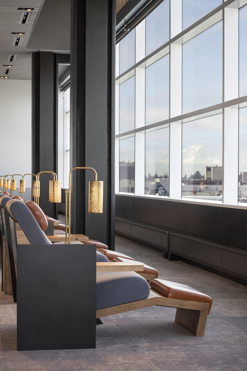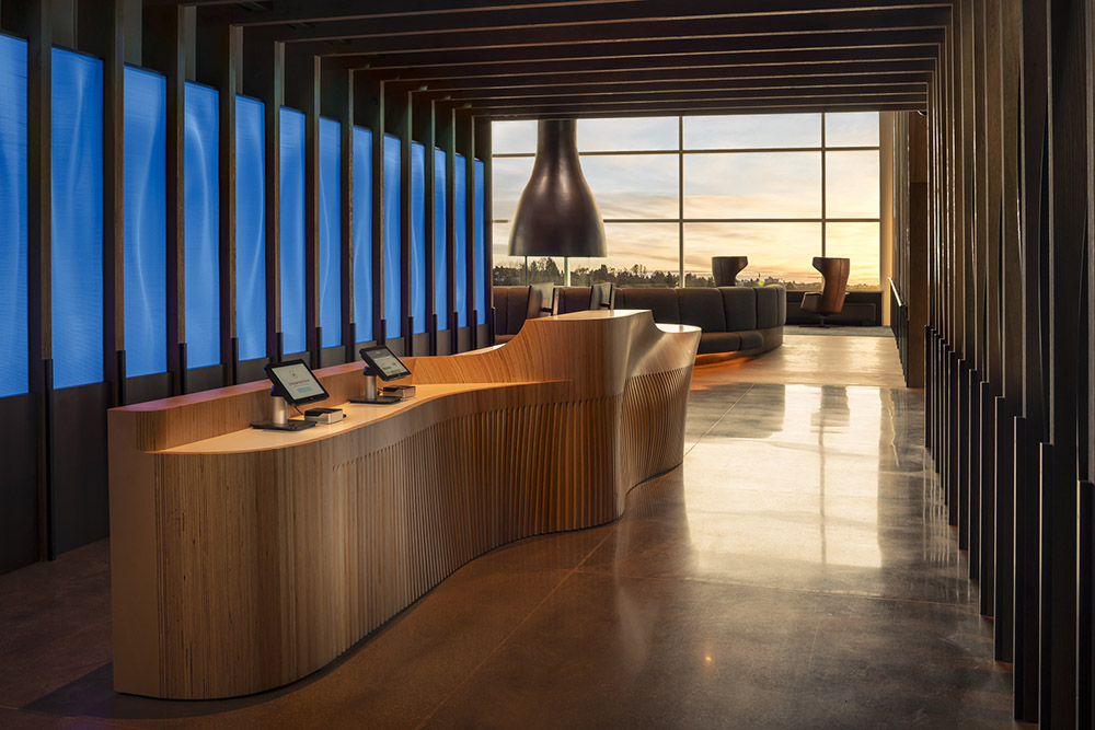 Local manufacturers created custom elements throughout the space, including lights whose shapes resemble jet engines. Alaska Airlines honors the legacy of the West Coast by showcasing local and regional manufacturers and artists and offers guests a connection to the Seattle region.