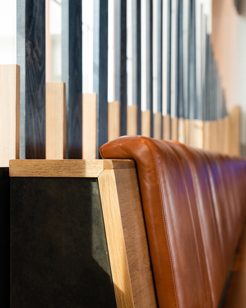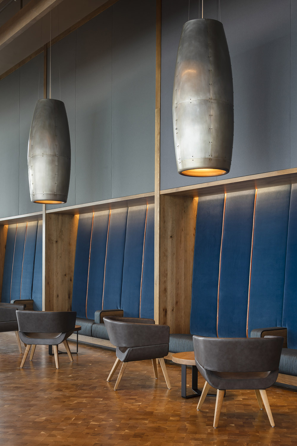 The spaces are loosely separated by a series of oak and woven metal screens and flow together. Each space has its own distinct furnishings, acoustical properties, materials and lighting and each guest is given the opportunity to feel at home