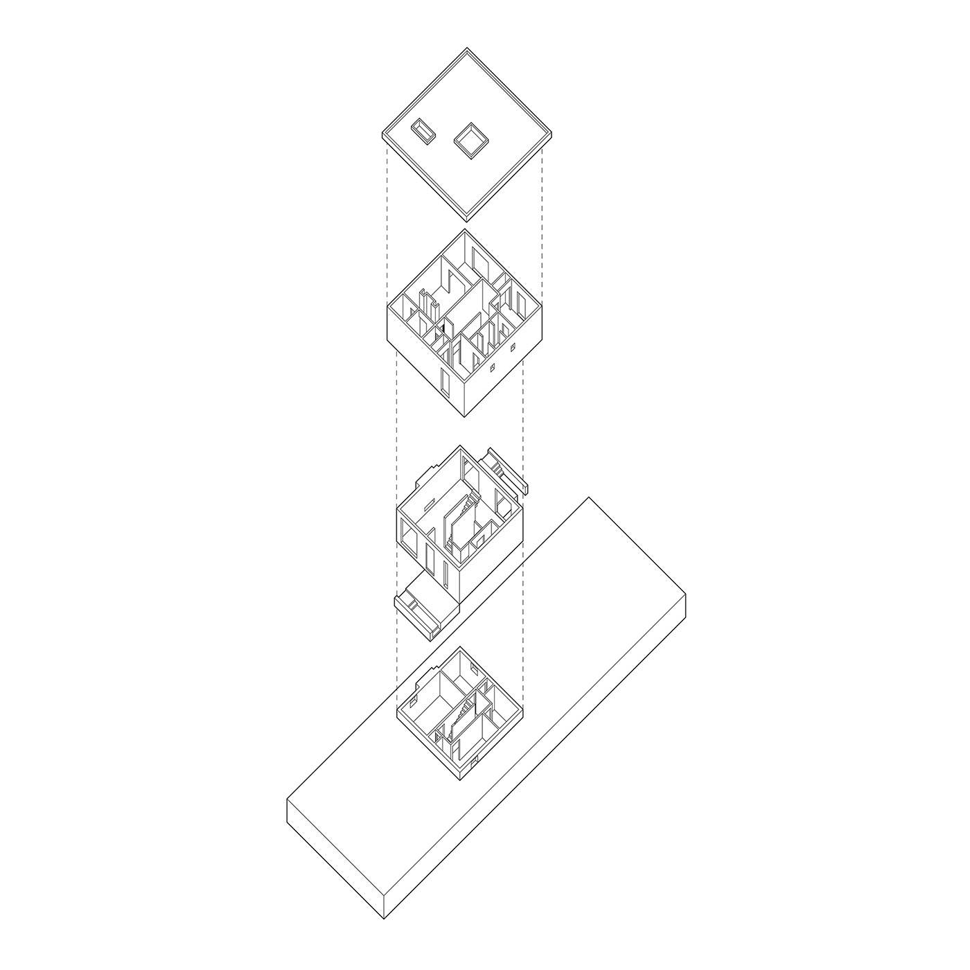 Albers House is a renovation-expansion project by Atelier RZLBD of a pre-existing bungalow, completely renovated on the inside and elevated by one level. The original building is stripped of its auxiliary post-construction structures. Thus, the genesis of the project becomes its original square footprint and the existing off-center staircase to be preserved. Paying homage to Josef Albers' square, the idea for the renovated architecture of Albers House is that of an offset of square volumes, radiating from the central volume containing the staircase, the void, and the large square skylight
