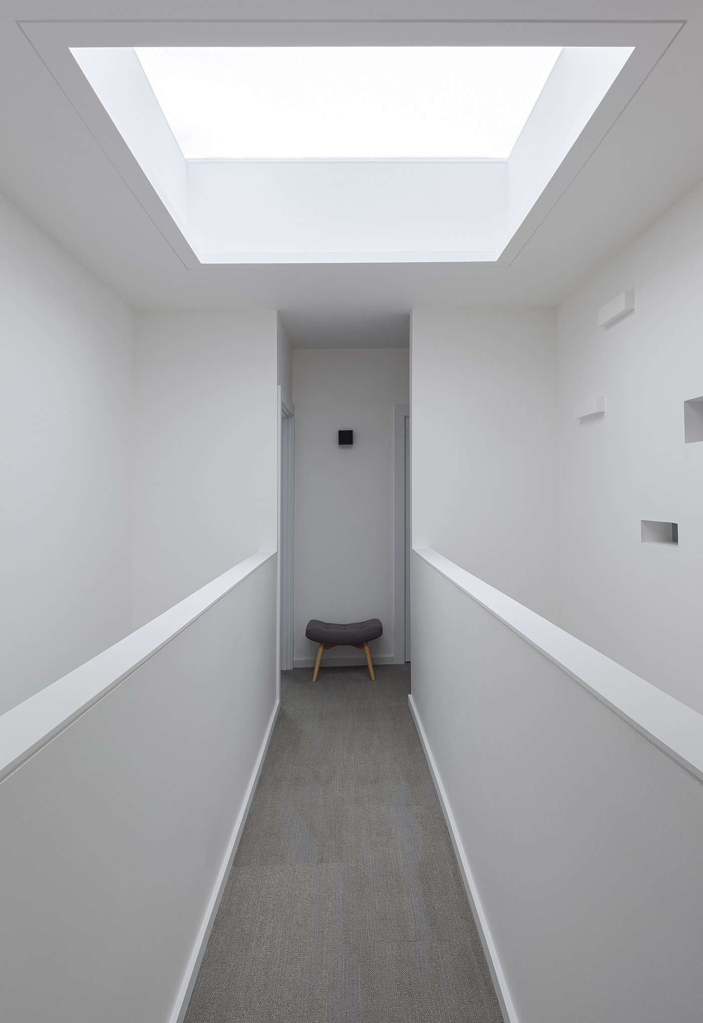 The staggered triple-height void, culminating in the square skylight, not only provides a poetic source of light but also serves as an axis mundi, drawing the gaze and mind toward the zenith as the body moves across the horizontal planes. Its experience is further dramatized on the second-floor walkway, which, flanked by the two voids, evokes a sense of liberation from the ground, toward the vast open sky overhead framed by the square skylight