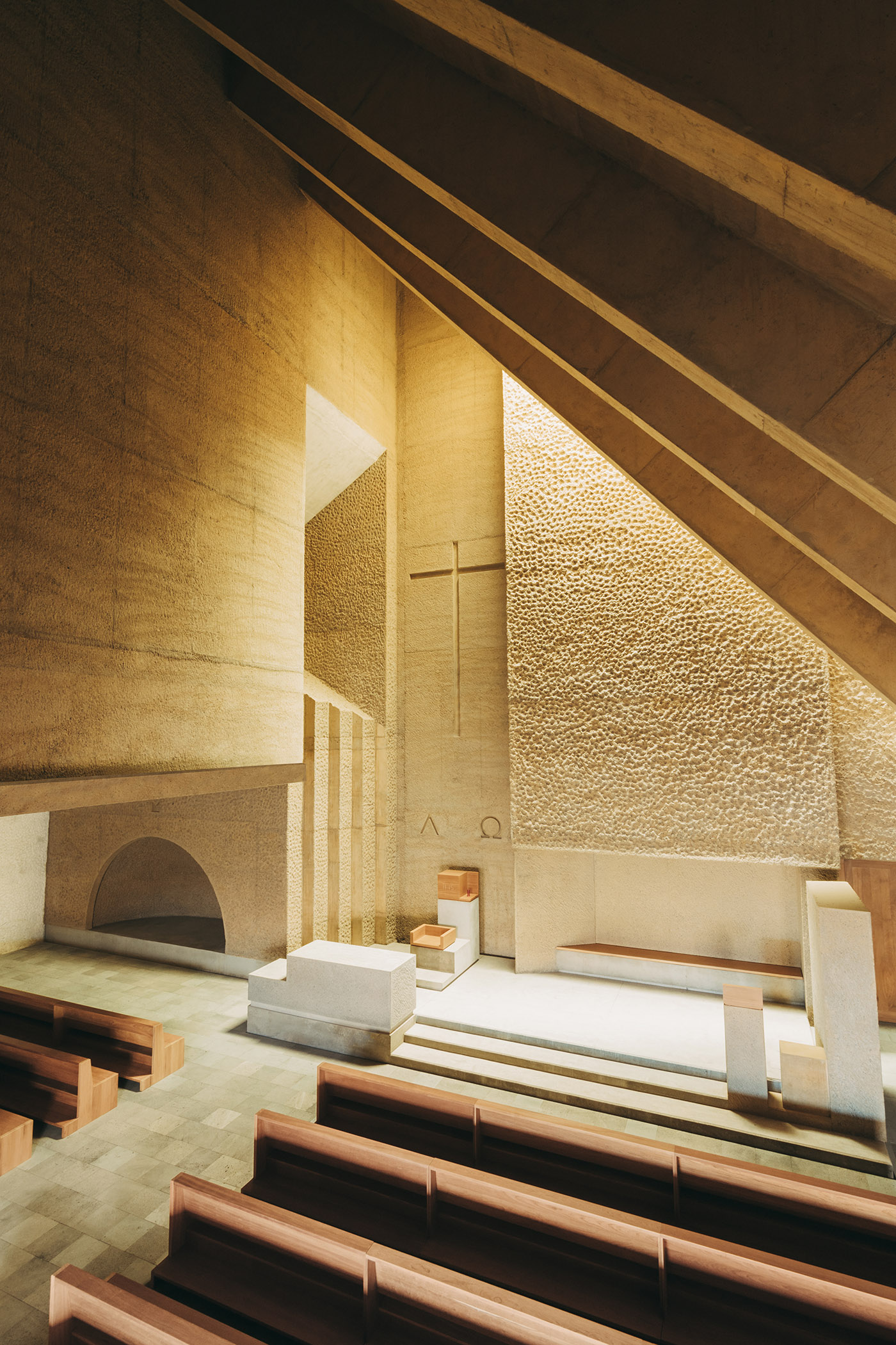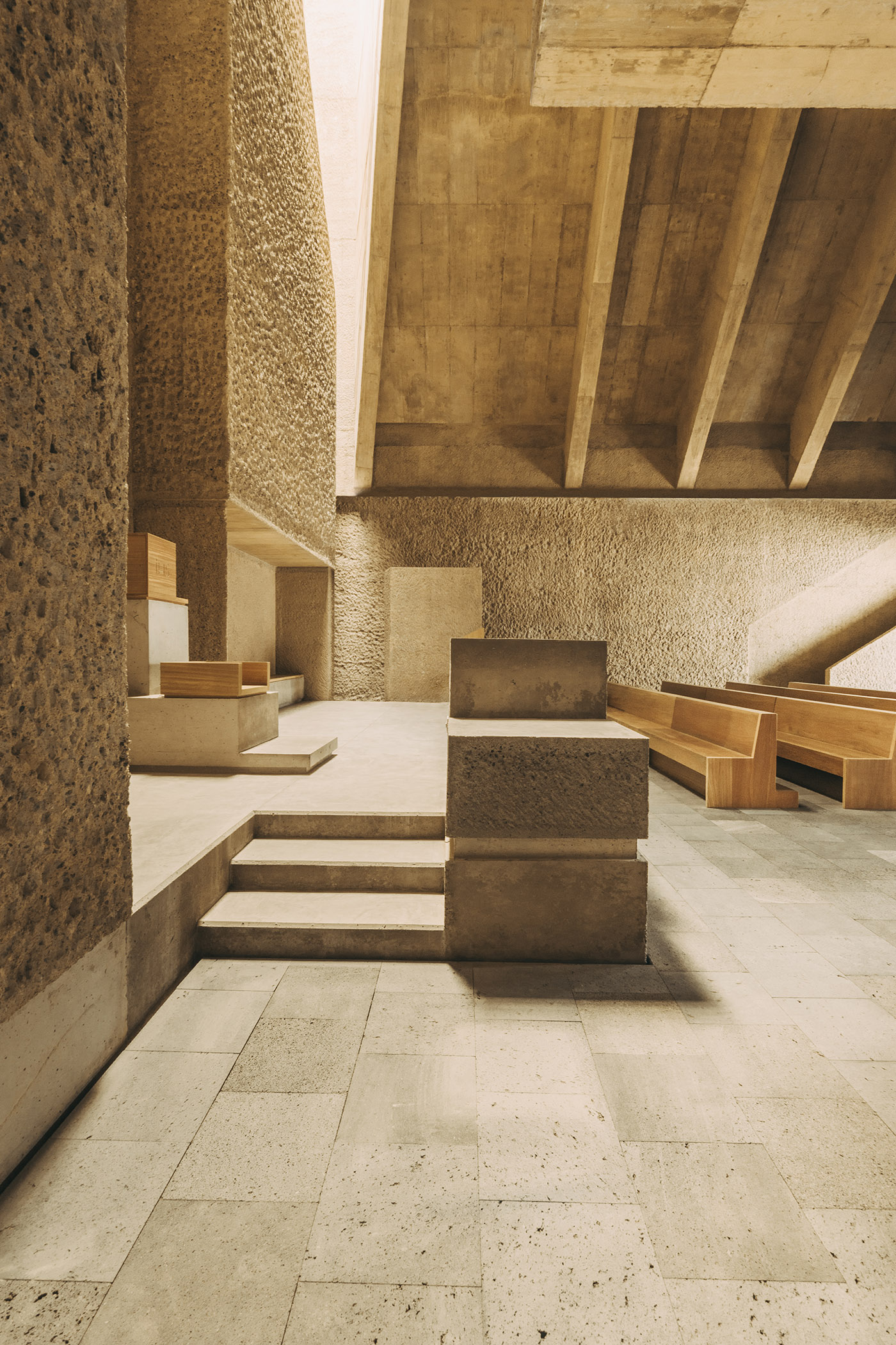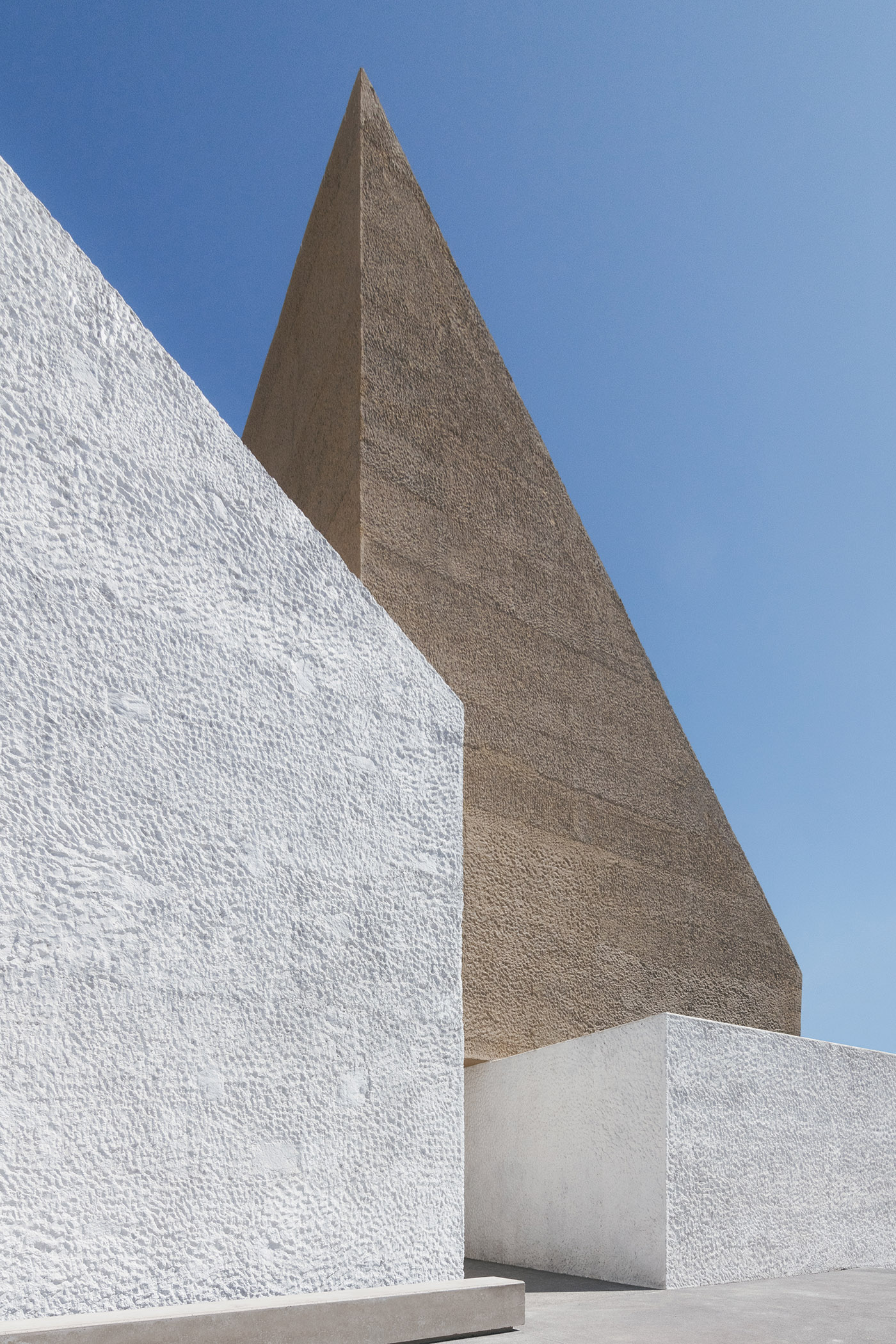 From a material point of view, the construction is very austere: the simplicity of the materials used and the use of resources such as natural lighting give the space an ascetic character which seeks the essential. The volume reminiscent of the old church is made of cyclopean concrete and has natural stone existing on the site. The chiselled finishes of this body are done in the traditional way with lime. The white of the lime contrasts with the ochre color used in the new volume, also made of concrete, this time coloured en masse and bush hammered with different shades