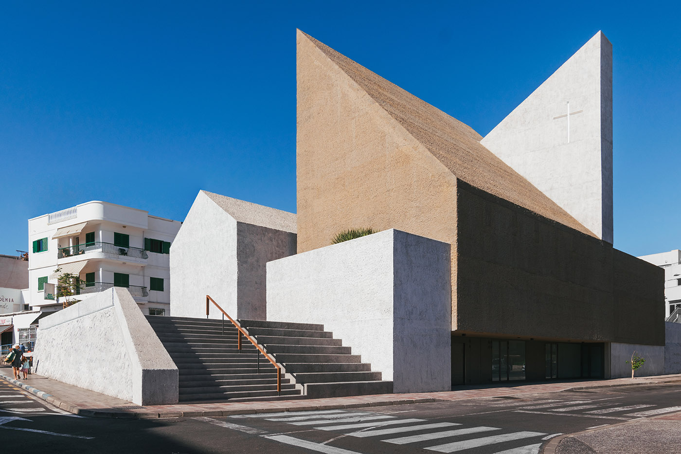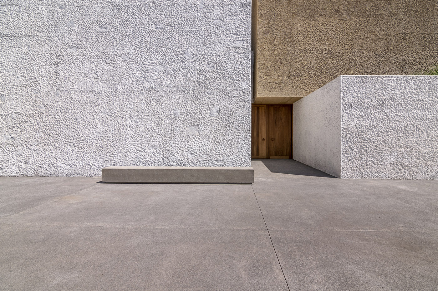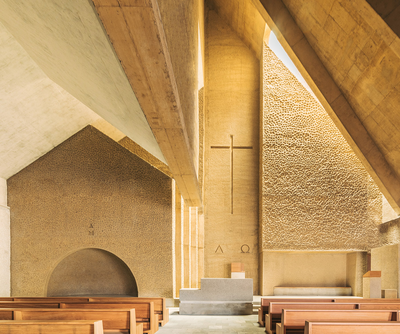 From a material point of view, the construction is very austere: the simplicity of the materials used and the use of resources such as natural lighting give the space an ascetic character which seeks the essential. The volume reminiscent of the old church is made of cyclopean concrete and has natural stone existing on the site. The chiselled finishes of this body are done in the traditional way with lime. The white of the lime contrasts with the ochre color used in the new volume, also made of concrete, this time coloured en masse and bush hammered with different shades