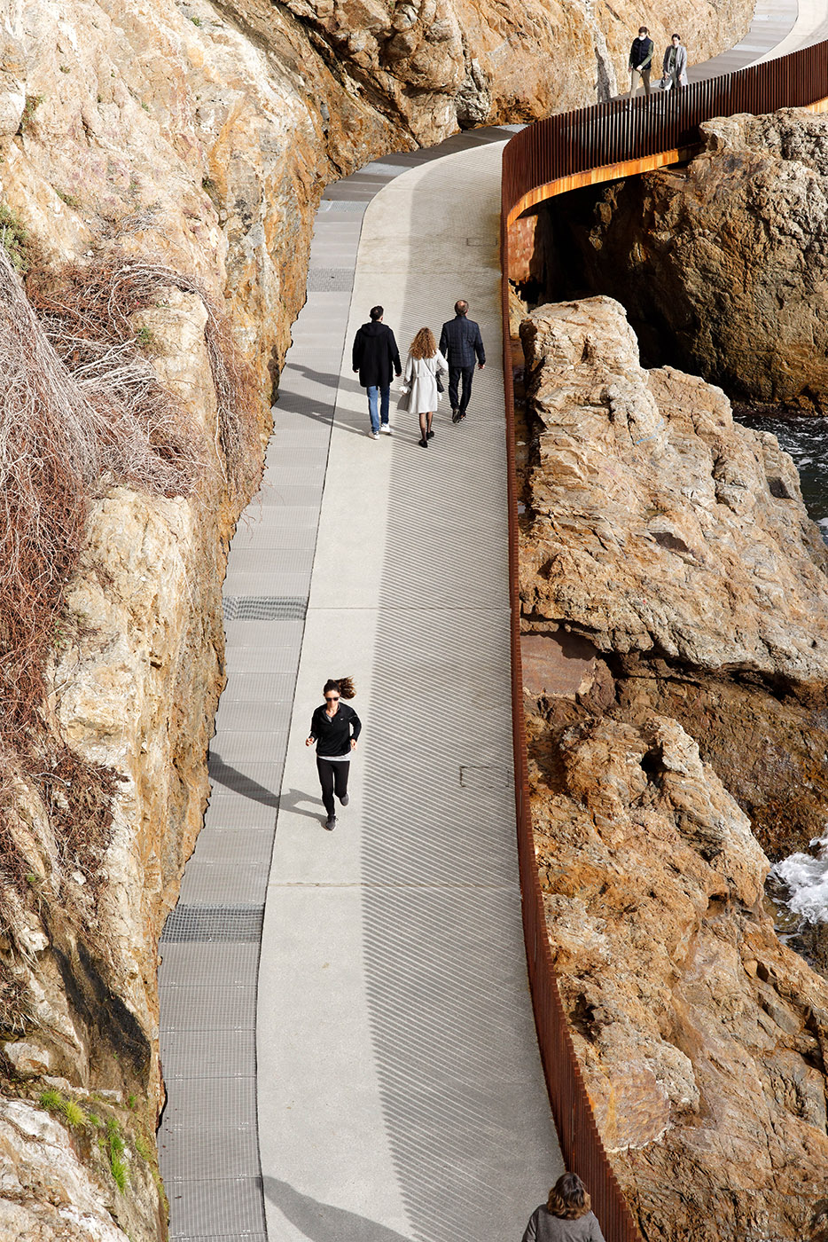 Aldilonda means "above the sea". The studio specialized in outdoor projects and urban furniture Dietmar Feichtinger Architects, with local architects Buzzo Spinelli, Insitu landscape, and engineers from Sbp France, creates a path anchored in the rock, with sinuous lines, that appears suspended over the water, at the foot of the citadel of Bastia.