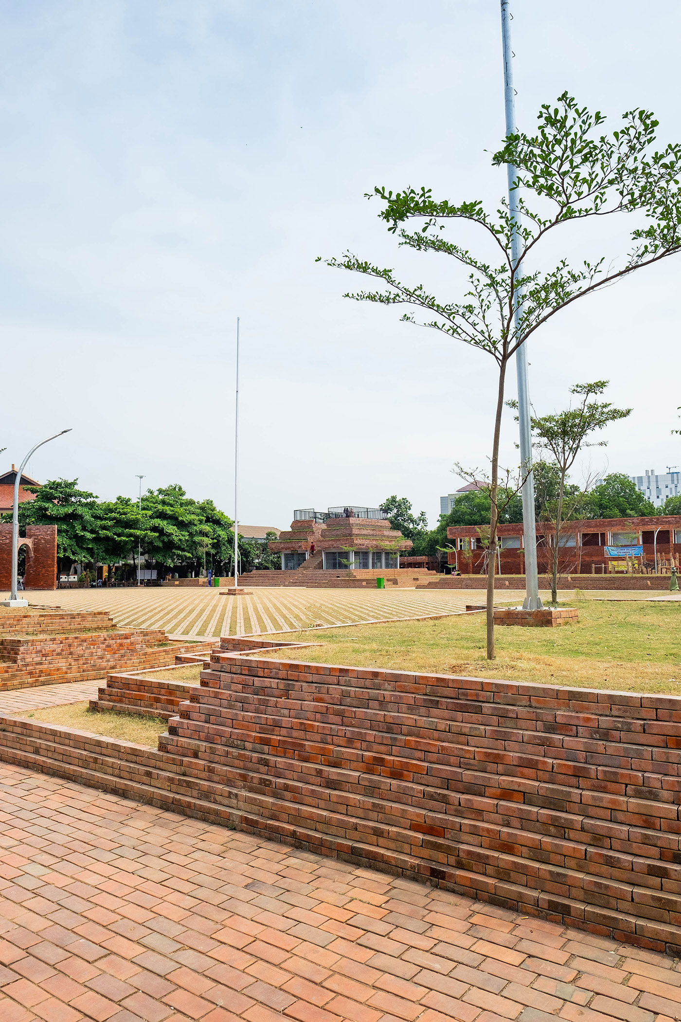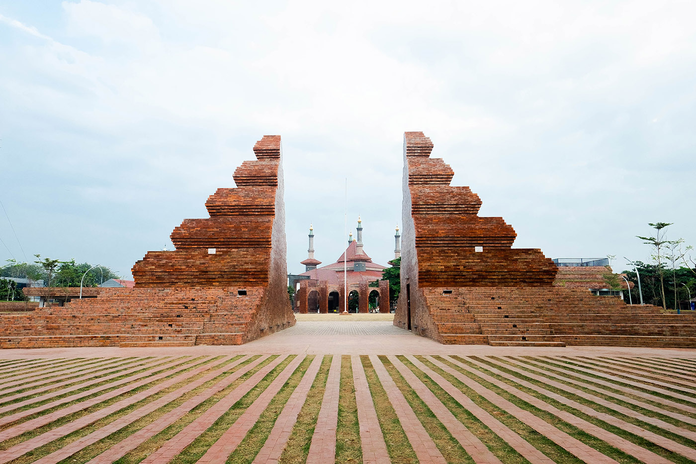 The outdoor project, commissioned by the governor of West Java from the firm SHAU Indonesia, brings together the wishes of the various buildings facing the square: the desire for a prayer area for the mosque, a public space for the municipality and citizens to gather in the center of the city, and the reinstatement of an obelisk-shaped historic monument