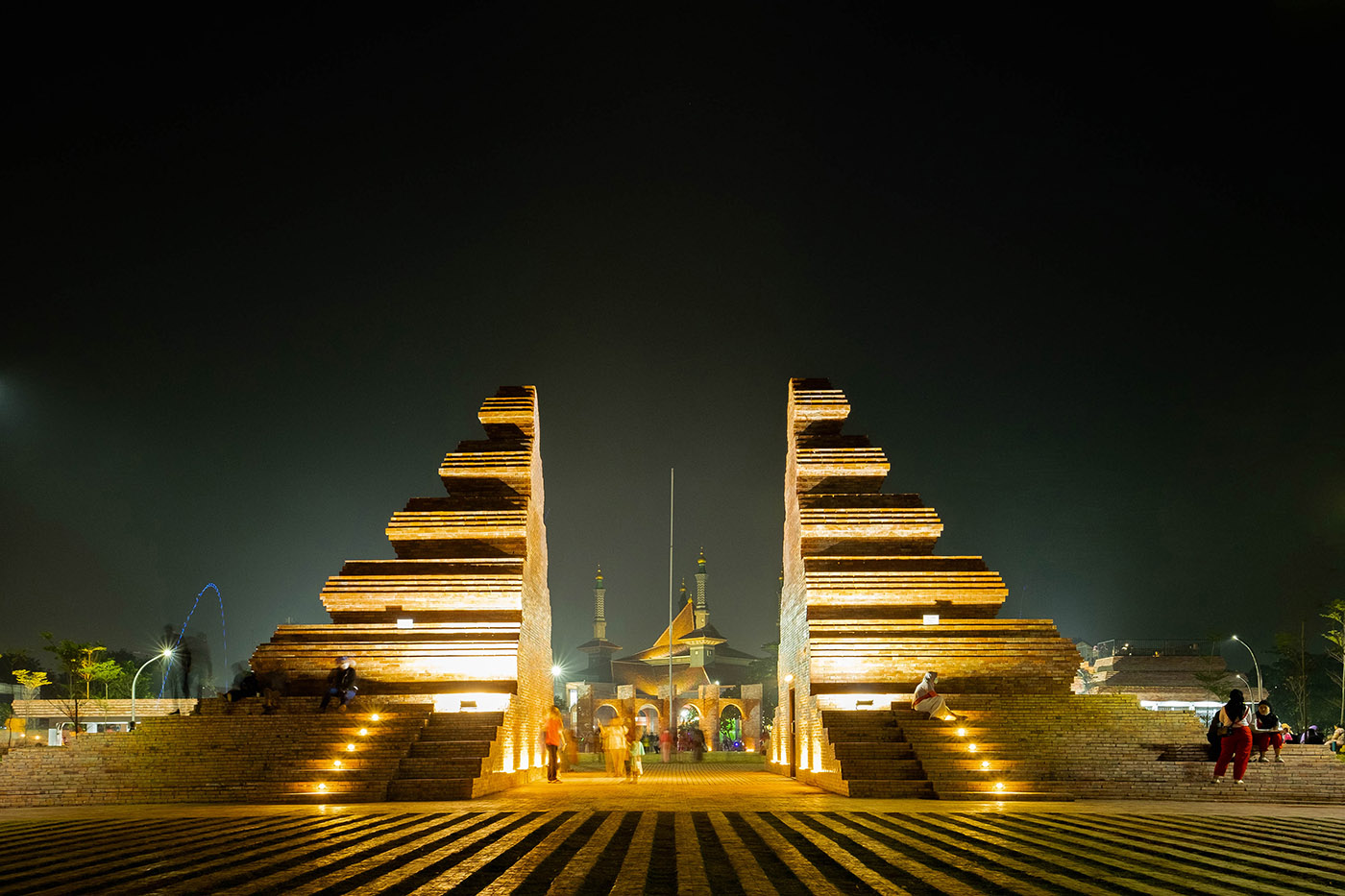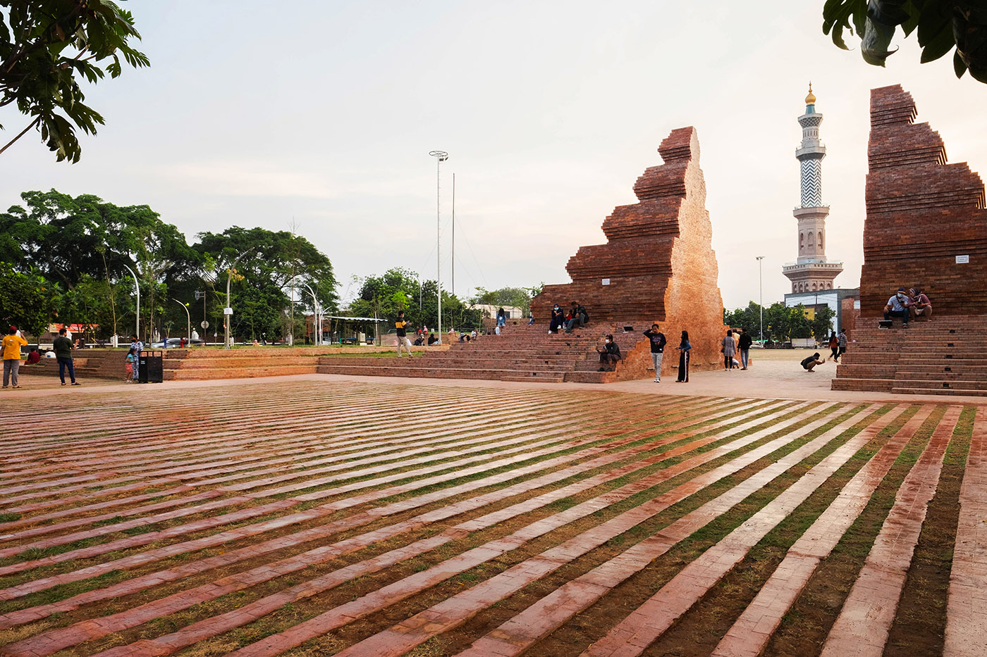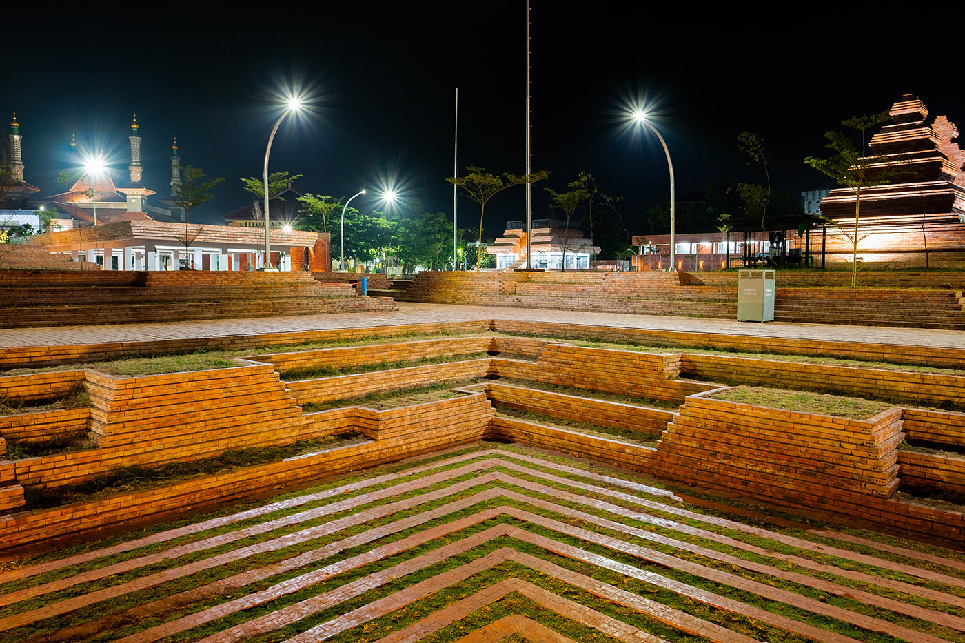 The goals also included maximizing green areas in order to improve the micro-climate, rainwater management in the form of a stepped planter landscape which structures all functions, circulation and intermediate spaces. An iconic Gapura marking the entrance from the city was installed on one side of Alun-alun and a five-pillar gate marking the entrance from the At-Taqwa Mosque was installed on the opposite side. Both opposing gates represent a dialogue between worldly and spiritual needs, emphasizing an open dialogue with the intermediate plaza as a gathering place