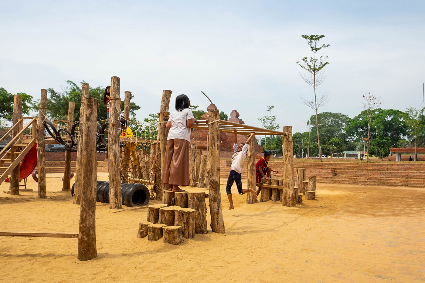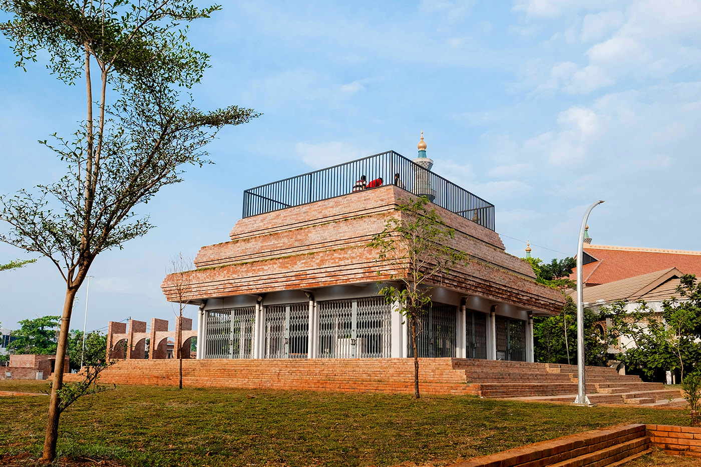 Both materials and geometry refer to traditional elements that are reinterpreted in the topography of the planter, the shelter and to the micro-library in a transformative way in which each element derives from the same material, language and construction logic. By choosing brick as the main material for Alun-alun Kejaksan, he not only refers to the historical places of Cirebon, but also adheres to practical aspects such as the availability and stimulation of the local economy, while using a contemporary design language