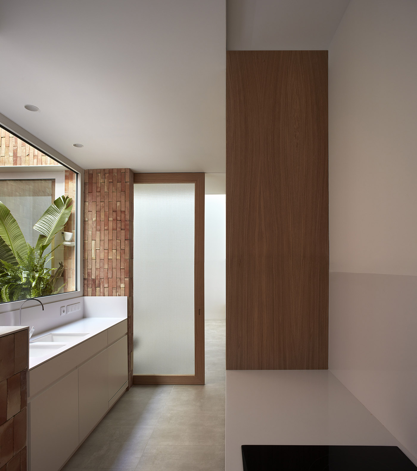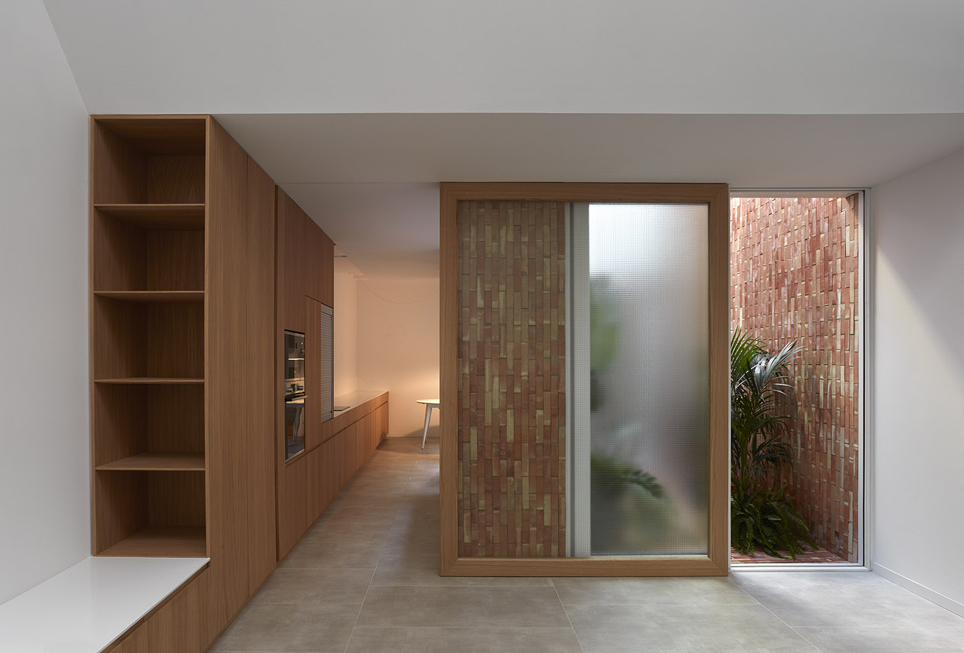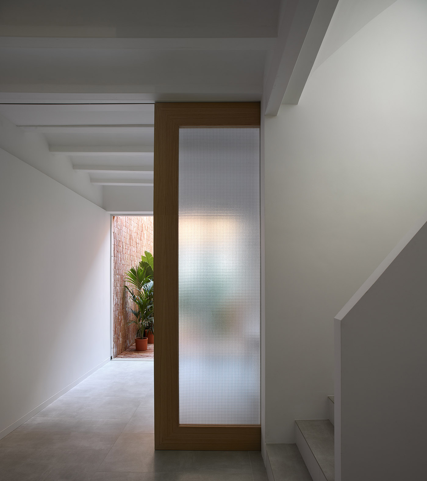 The ground floor of AM House houses the public part of the dwelling, developed for the whole extension of the building in its 5 meters wide by 22 meters long. The proposed spatial sequence is intended as a single space that in each of its parts has a specific dimension and linked to different functions. It is the patio that shapes and gives meaning to the sequence: a space of contemplation, but also functional, defined more by the materials that compose it than by physical partitions being conceived as an intentionally diffuse space to connect with adjacent rooms