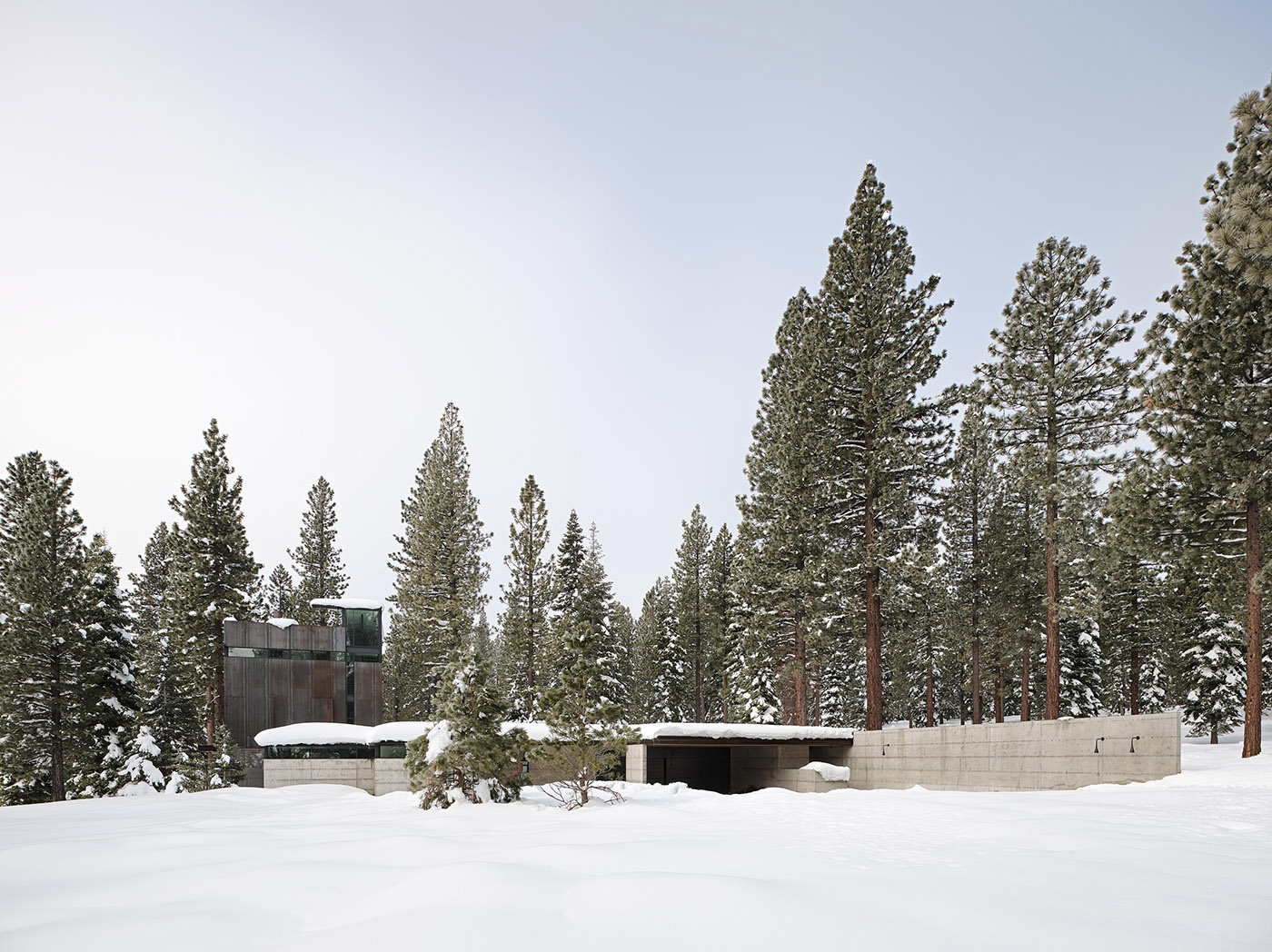Designed by Olson Kundig in collaboration with the client, an architect based in Truckee, California, in one of his architecture projects, Analog House celebrates the desert site on which it stands, rugged and populated only by Ponderosa pines, Manzanita, and basalt. The interior palette of the residence features concrete and steel: as soon as you enter, a steel mesh staircase wall along with the skylight opening invite daylight into the interior spaces, simultaneously defining the environment.