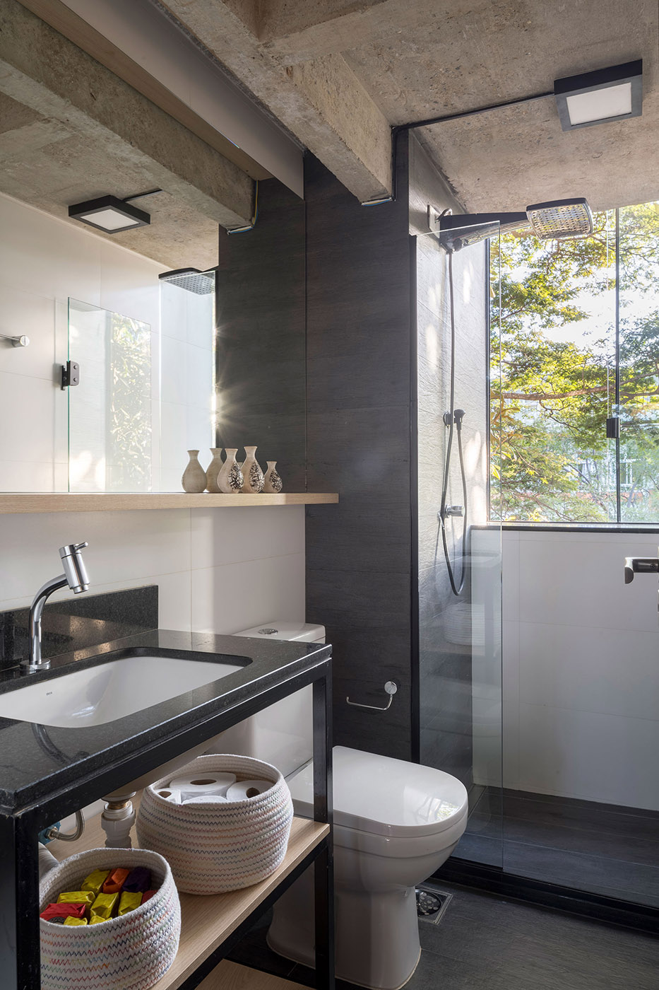 The final effect is a continuity of material between the interior and exterior of the apartment, specifically emphasized in the shared spaces. The demolition of the original walls revealed three structural columns that made it impossible to integrate the living room and kitchen. Finally, it was decided that the kitchen should be relocated to the living room, the living room to the larger bedroom and the bedroom to the kitchen, completely overturning the layout