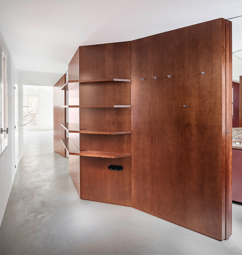 The renovation of the apartment in Parlament Street in Barcelona consists in filling a blank canvas with furniture sinuously shaped to define the living spaces. One of the challenges of the project was to try to create a spatial continuum for all the 80sqm, at the same time subdivided in some way in contrast to the original layout.