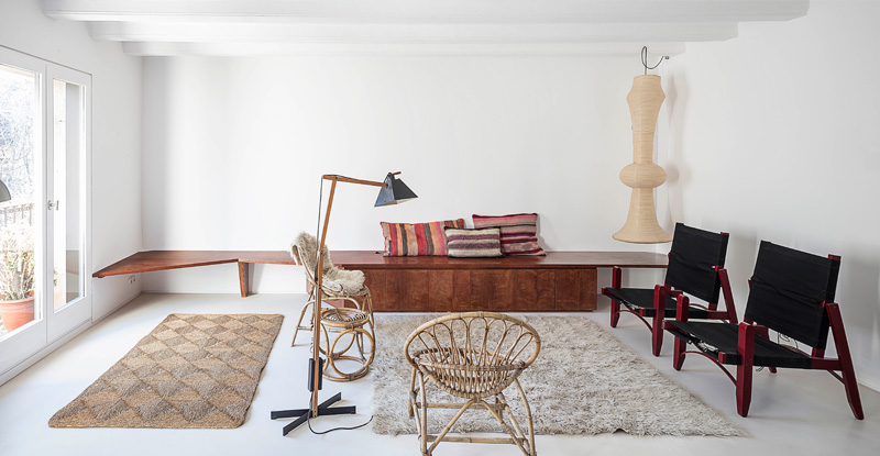 The first decision was to clear the space and to merge it with the white colour, transforming it into a white canvas. In this way the space, defined by three patios and the supporting wall appears to be more spacious. Once the space appears empty, the furniture is placed inside it.