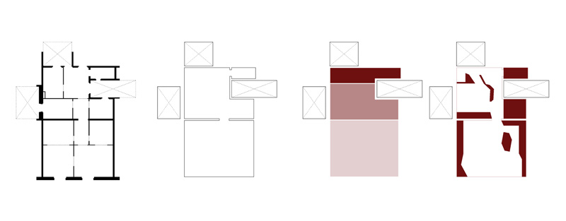 The space is divided into three bands, from the access to the facade. More or less closed and more or less bright spaces. The first strip includes a toilet and bathroom, connected to the technical patios. In the centre, the sleeping area is more internal and protected, while the kitchen and living room overlook the street to the south.