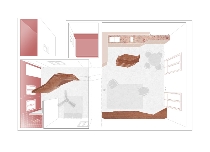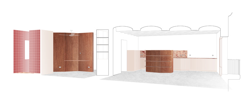 Thanks to the shape and materiality of the furniture, arranged in this neutral space, fluxes are created that increase the complexity of the space, such as the bench, bookcase, kitchen, sofa. The colours of the furniture range from pink marble to timber and cream colours.