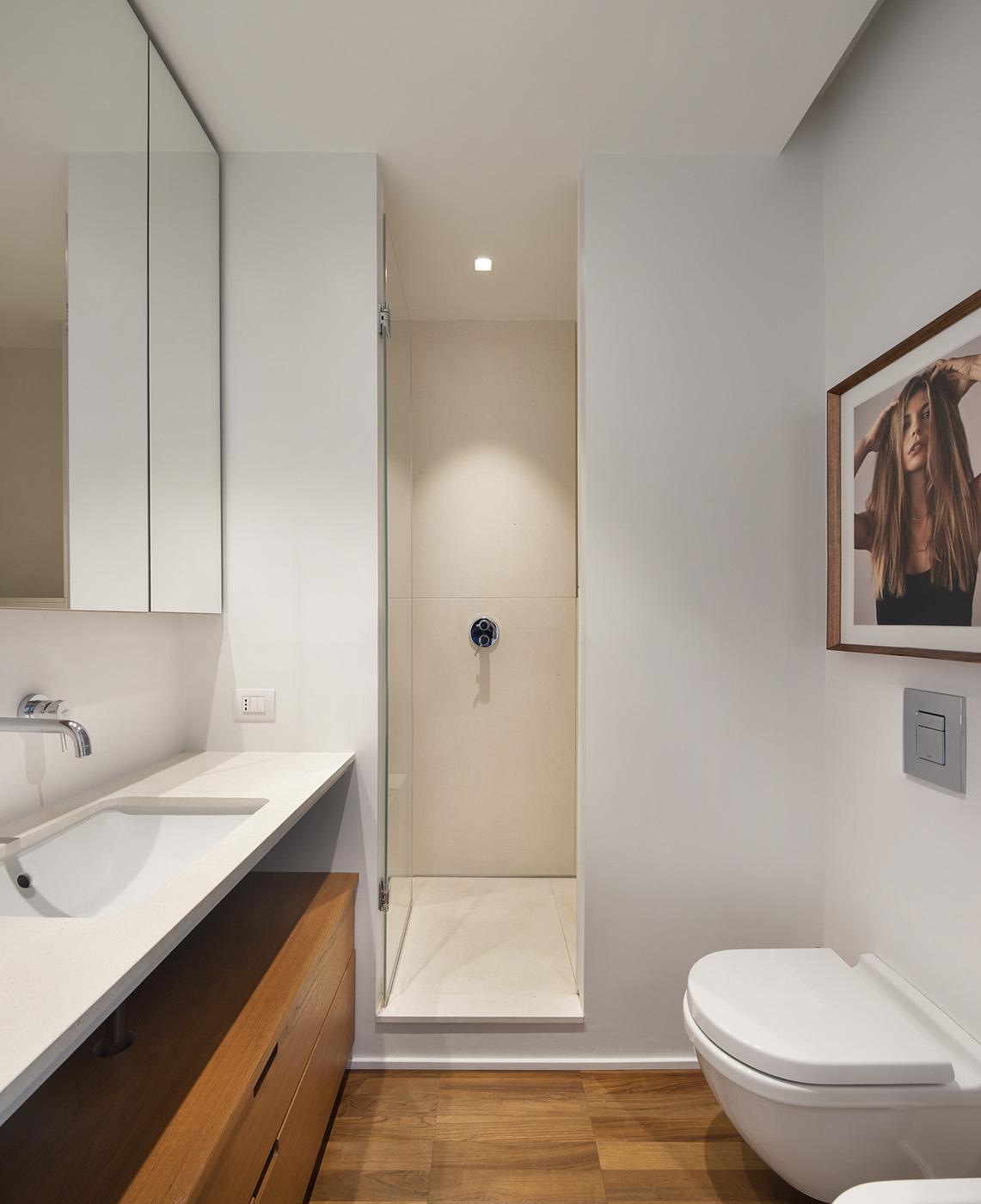 The process of reinterpreting the original architecture involves juxtaposing the new functional volumes to the historical elements and finishes, in order to preserve the atmosphere and character of the original apartment
