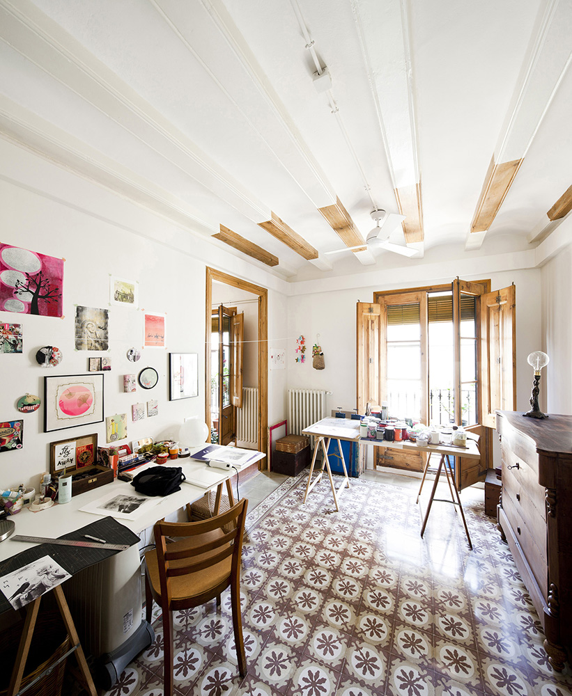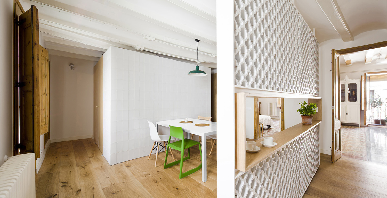 The apartment faces the street and features a bright interior patio, with the center of the home extremely compartmentalized. The first step was to clear out the central part in order to convert it into a single space, which could accommodate different domestic activities