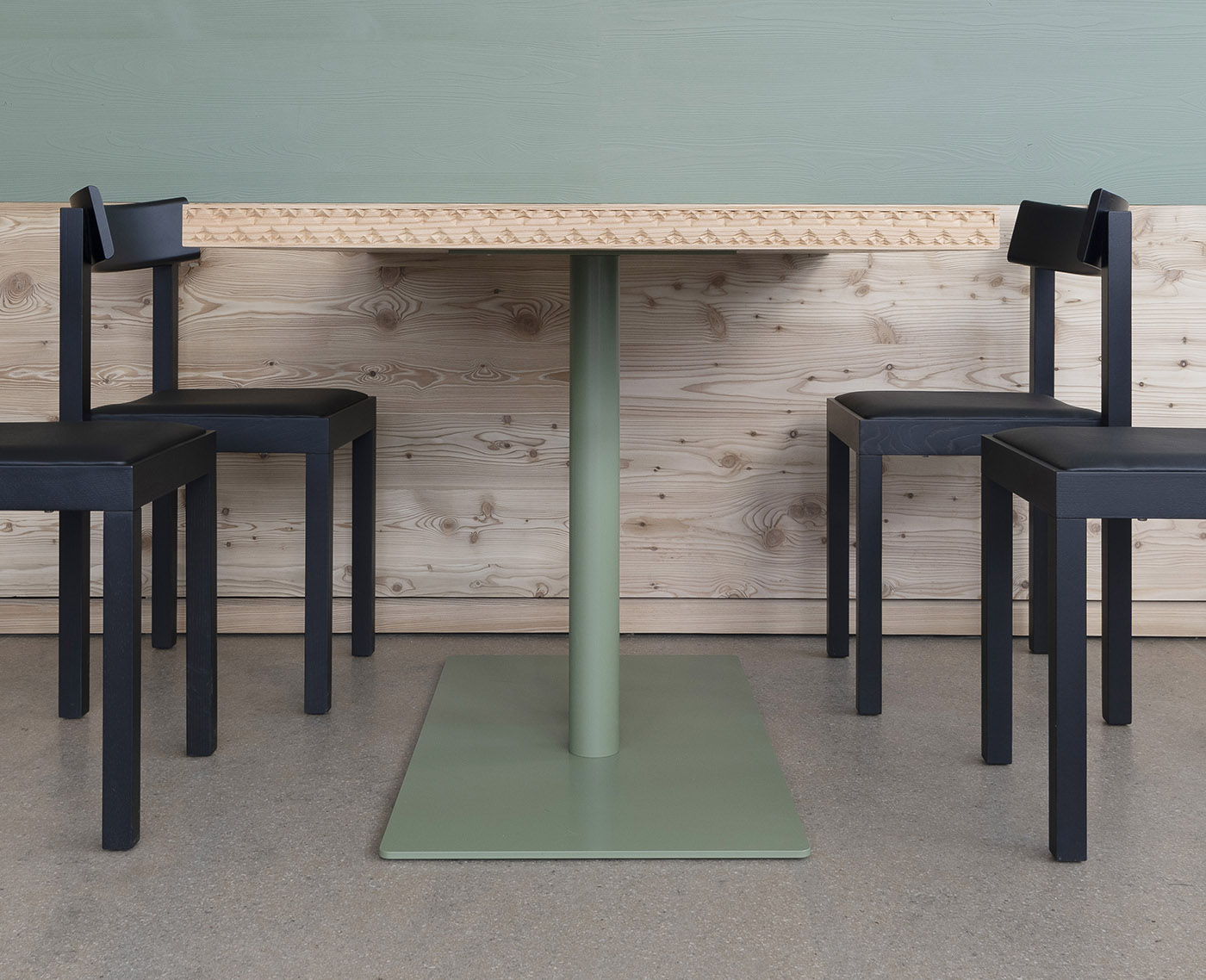 In terms of materiality, the building is inspired by the nearby listed structure: spray plaster inside and outside, and a larch wood cladding designed as a contemporary reinterpretation of the old decorative motif