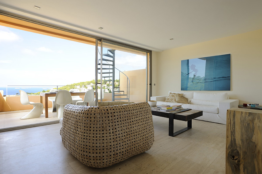 Where the scent of Mediterranean pines mixes with the crystal clear sea, Architect Francesca Cutini renovates a residence that overhangs close to the cliff of Es Vedrà with a view of Formentera. Away from discos and night noises, far from everything, the house is immersed in a park full of pine trees, the blue sky and an enchanting view of Es Vedrà and that stretch of sea in front of the Rabbits' Island
