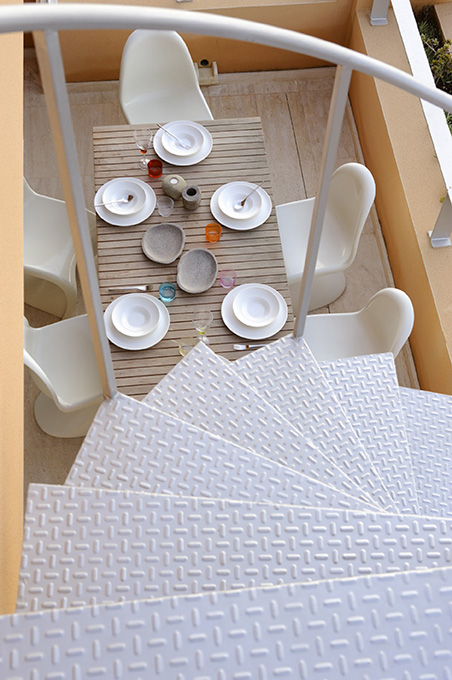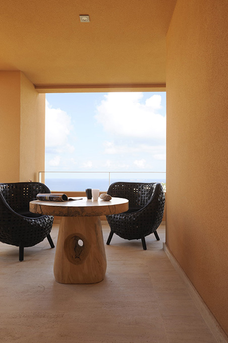 A philosophy of living, which Architect Cutini is pursuing in all his projects: respect for nature, combination of natural materials, such as untreated ground-level travertine or the tree trunk as the base of the table, mixed with design pieces such as the famous Verner Panton